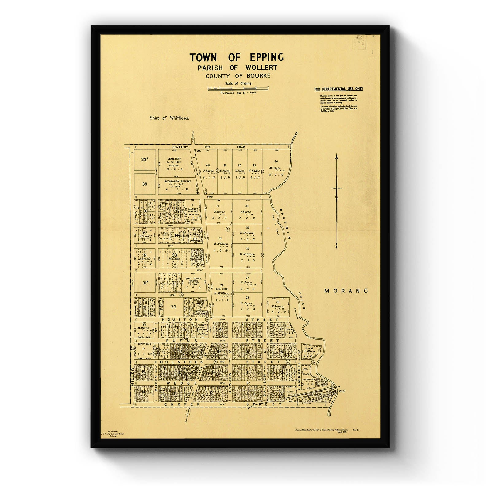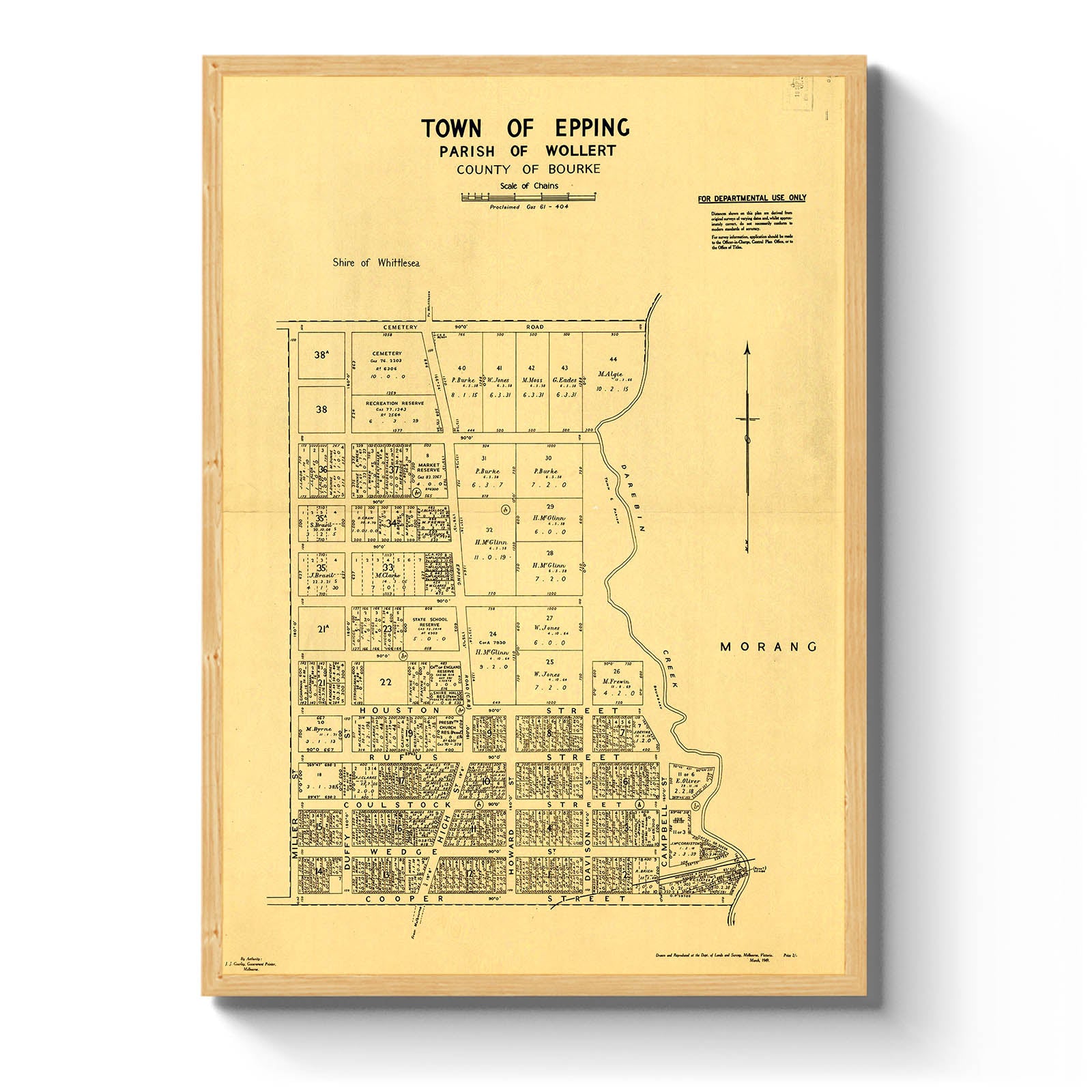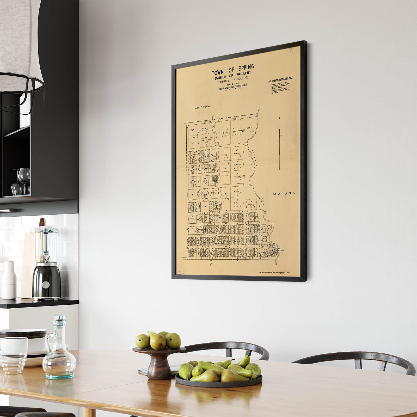 Recently moving to Harcourt and being interested in the history of the area, it seemed fitting to purchase a vintage map of the area which is displayed on our kitchen wall for us to study easily, identifying the block of land we bought. Nicely framed too.