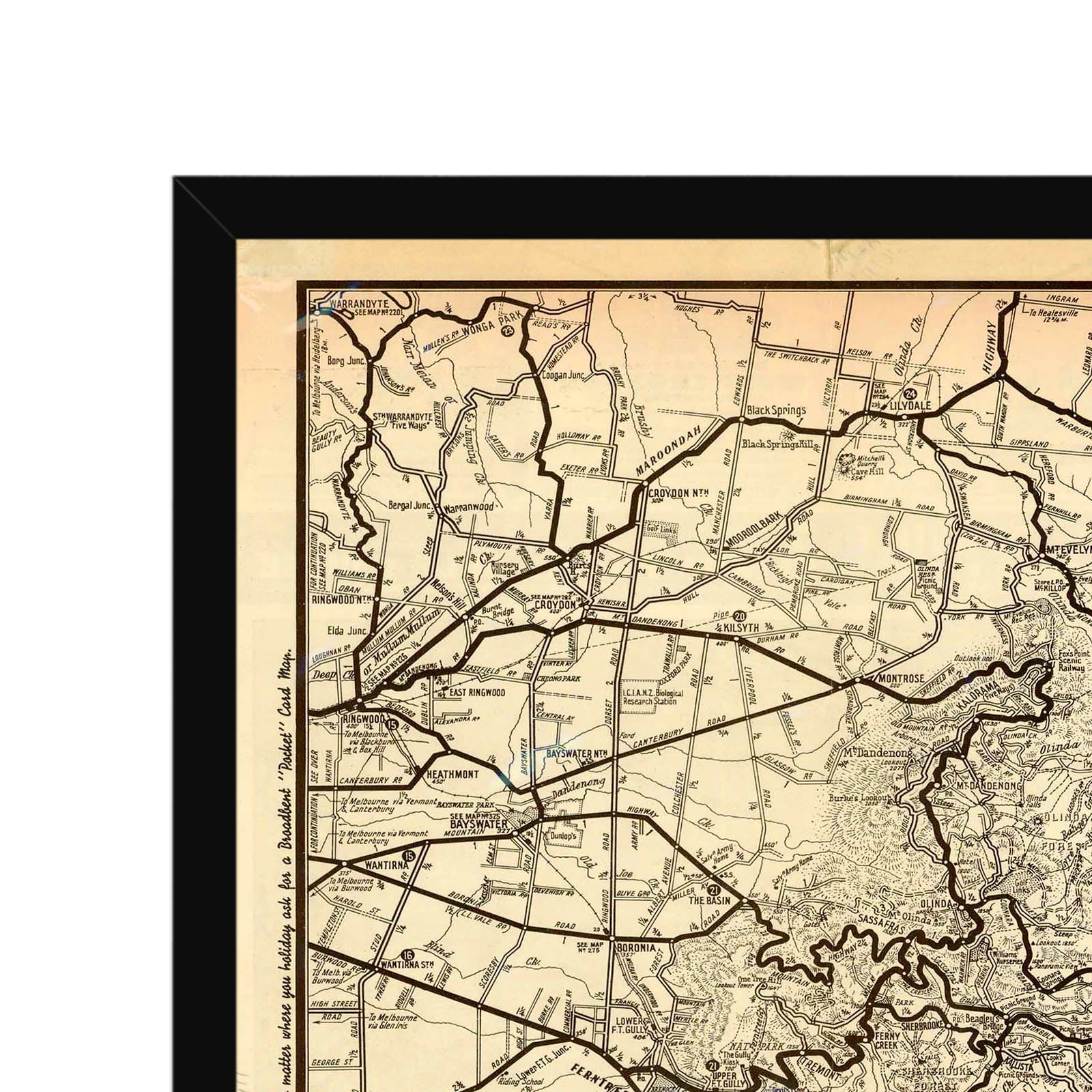Recently moving to Harcourt and being interested in the history of the area, it seemed fitting to purchase a vintage map of the area which is displayed on our kitchen wall for us to study easily, identifying the block of land we bought. Nicely framed too.