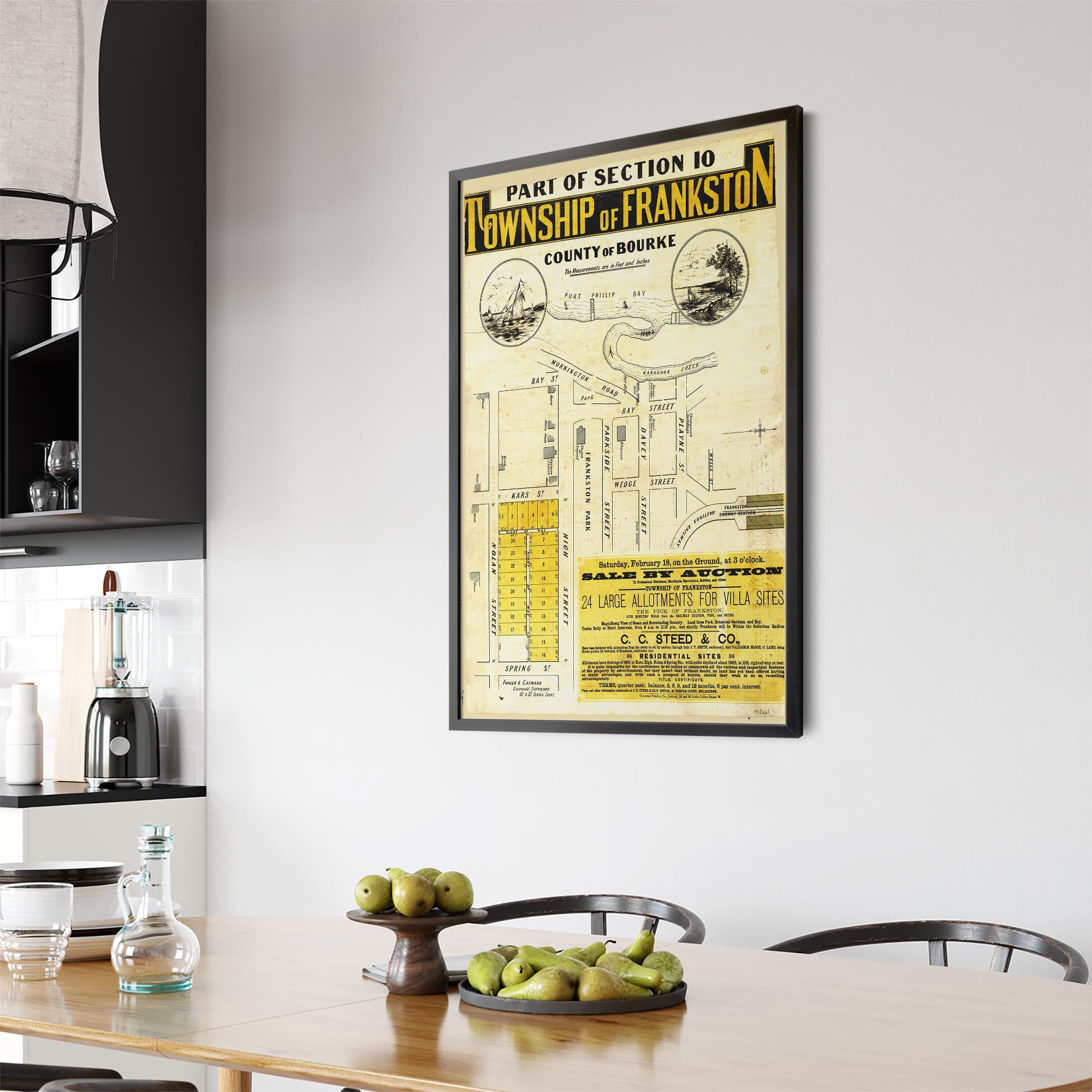 Recently moving to Harcourt and being interested in the history of the area, it seemed fitting to purchase a vintage map of the area which is displayed on our kitchen wall for us to study easily, identifying the block of land we bought. Nicely framed too.