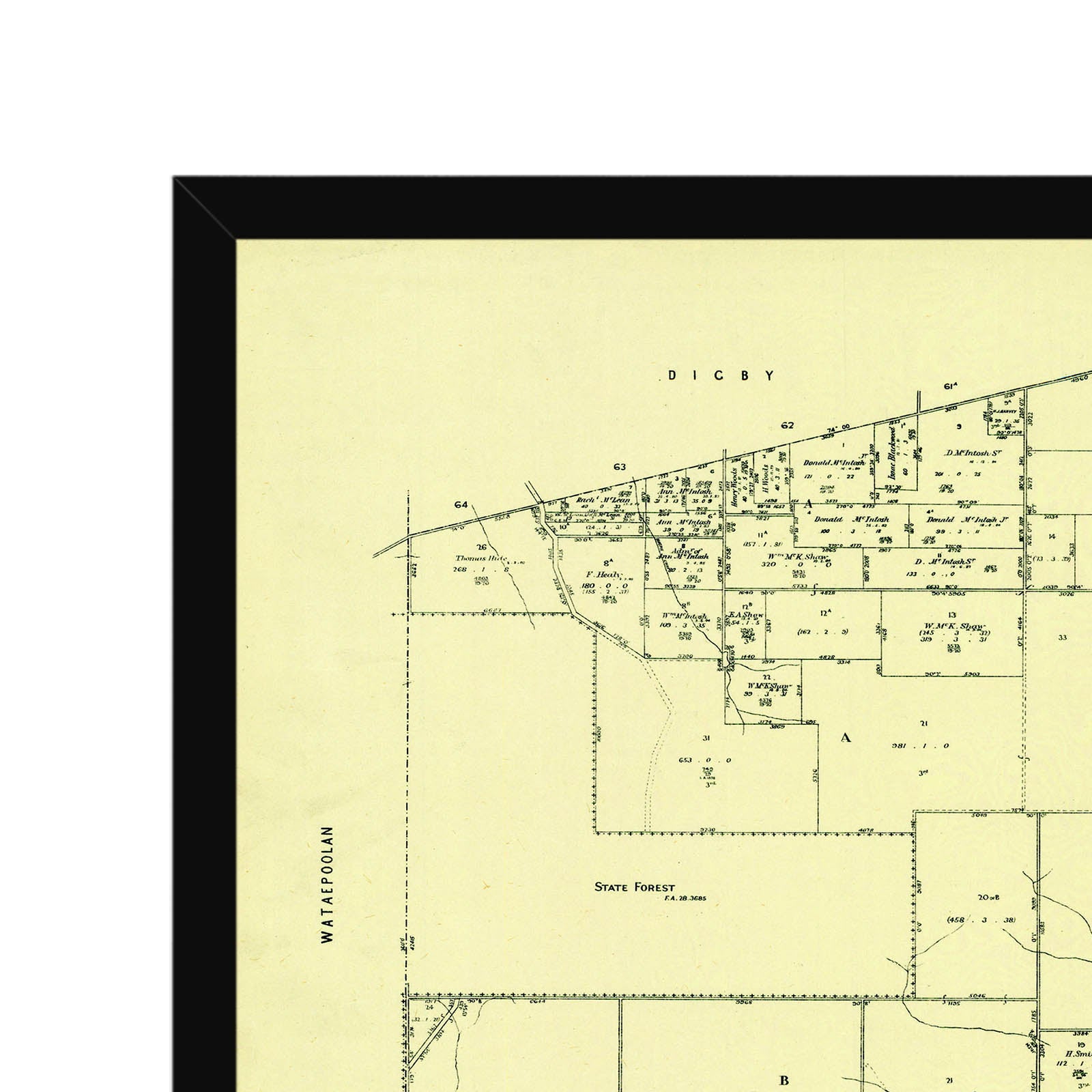 Recently moving to Harcourt and being interested in the history of the area, it seemed fitting to purchase a vintage map of the area which is displayed on our kitchen wall for us to study easily, identifying the block of land we bought. Nicely framed too.