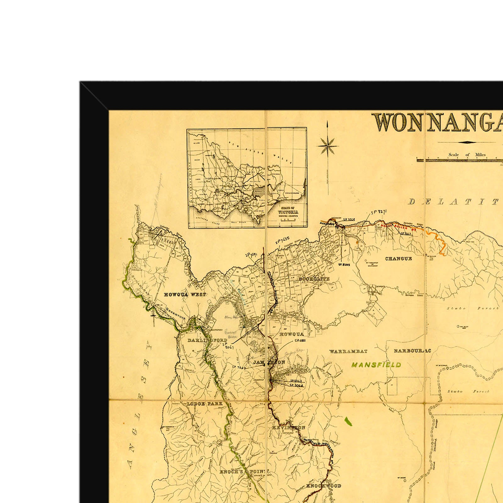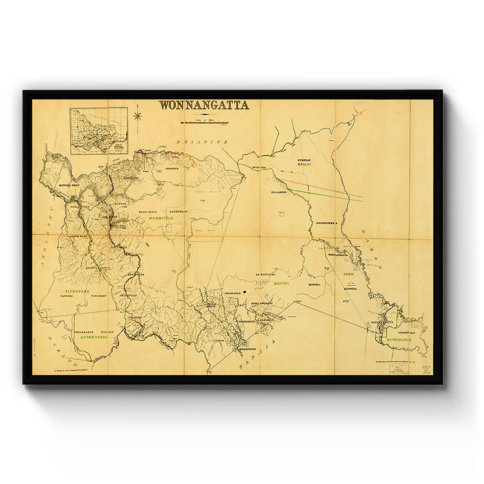 Inset: State of Victoria showing counties. Cadastral map showing county and parish boundaries.