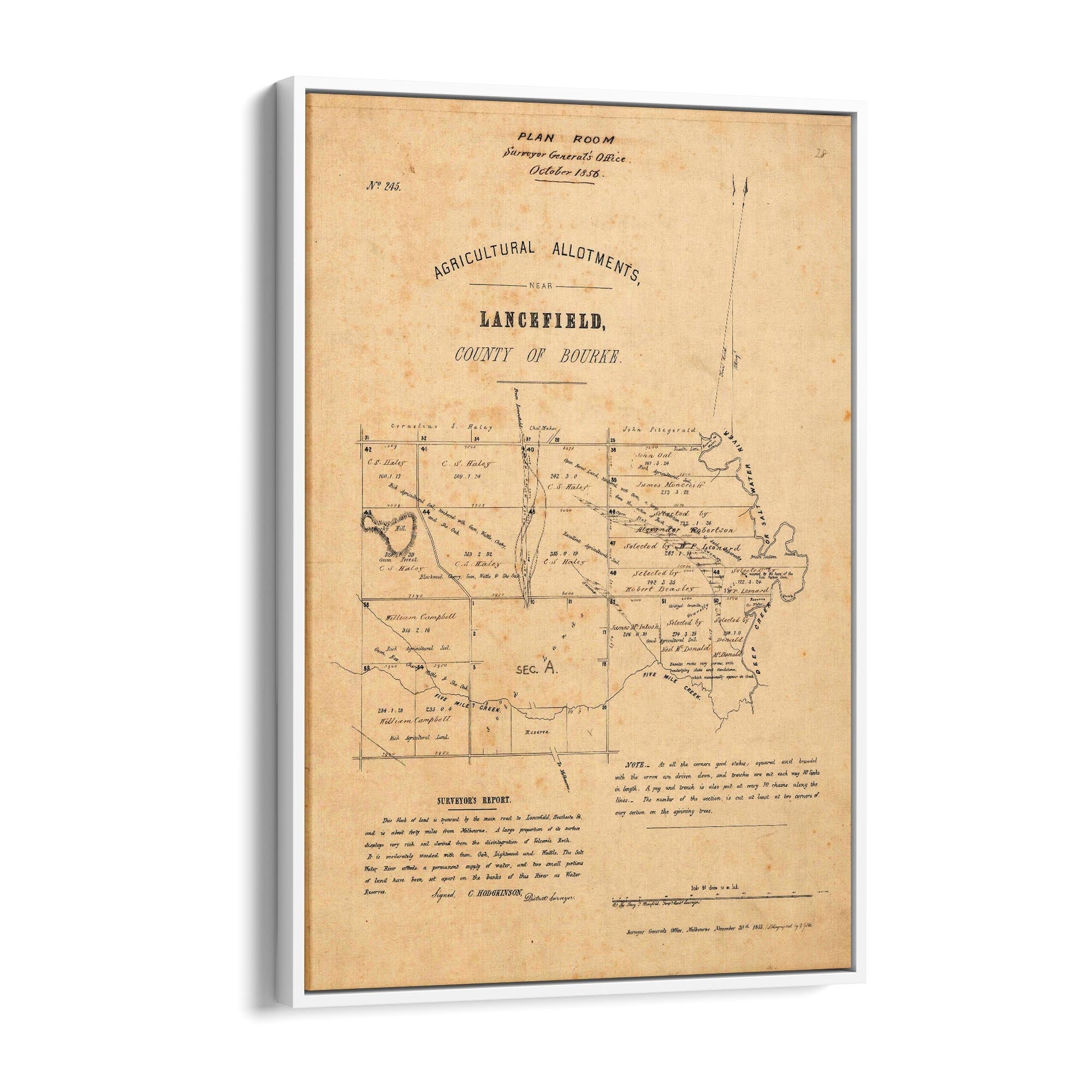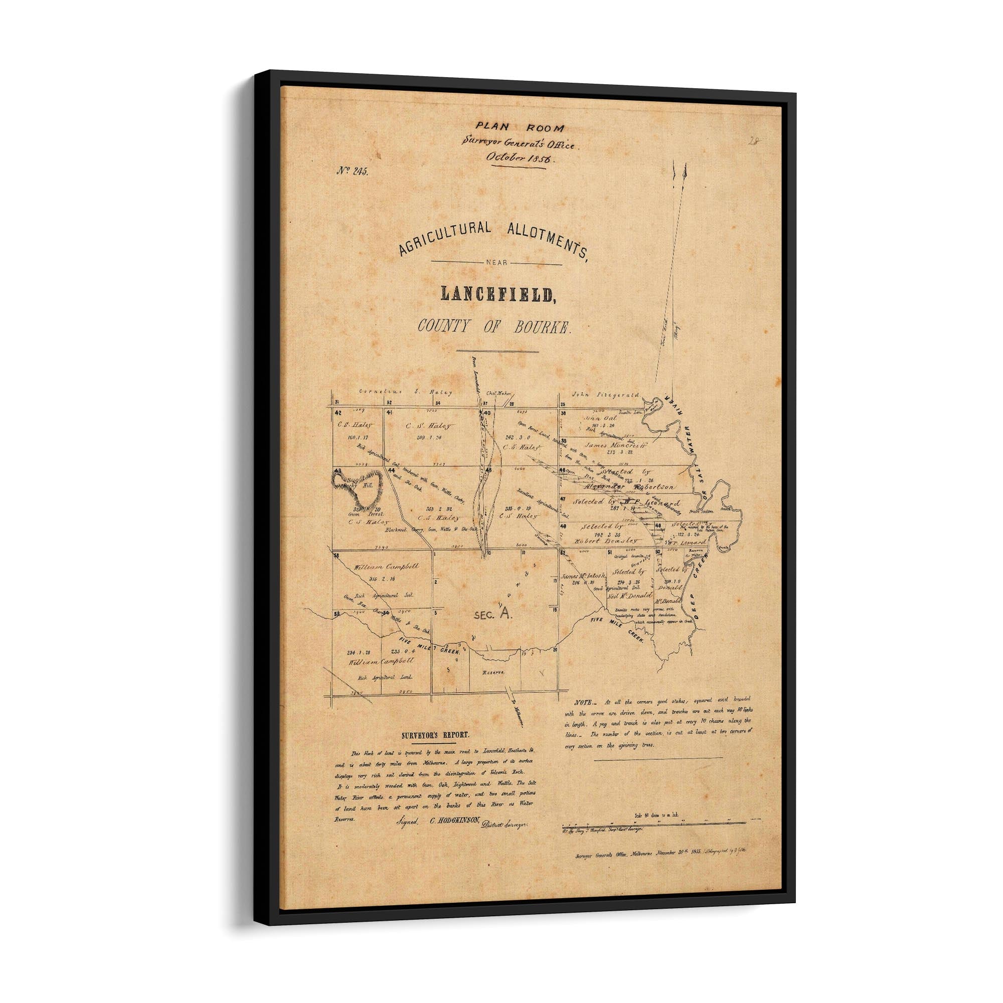 Map of allotments near Lancefield showing tracks, cadastral information, water reserves, Surveyors Report, "hut occupied by the heirs of the late Captain Cain", description of topography and vegetation.