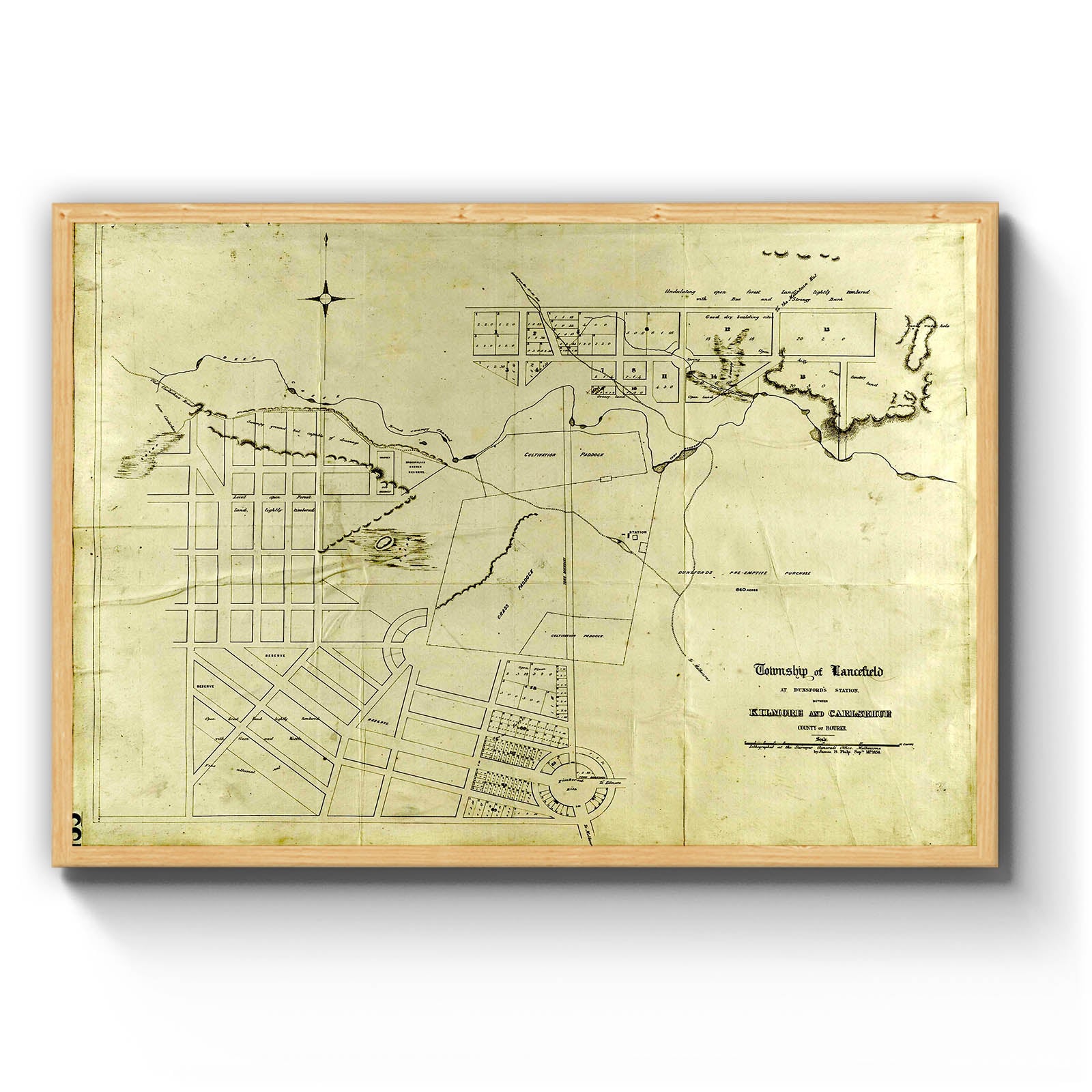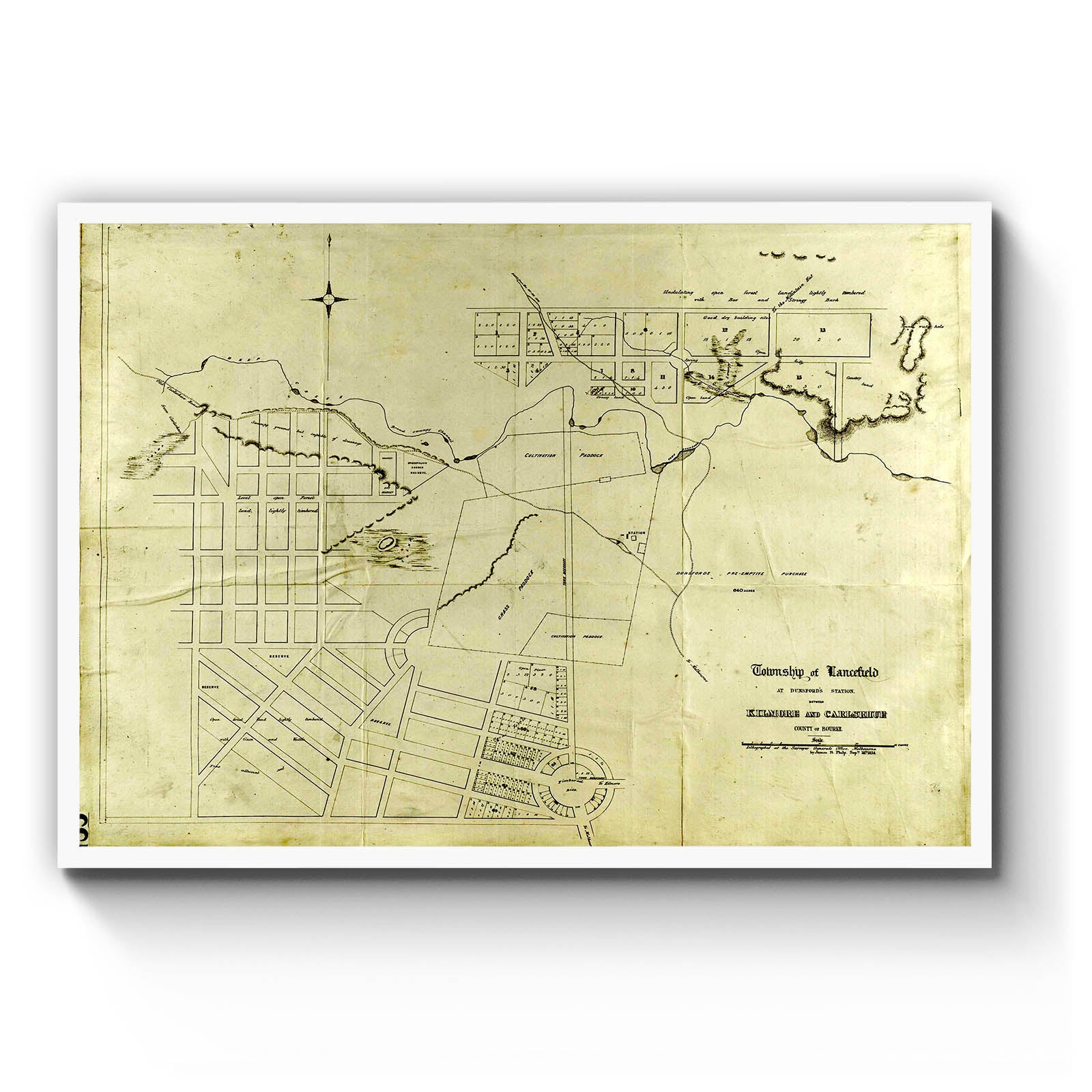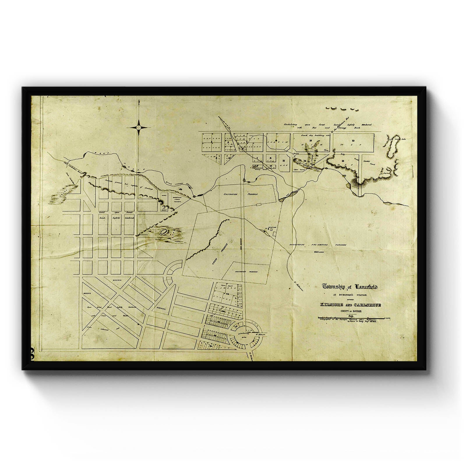 Township of Lancefield at Dunsford's Station between Kilmore and Carlshrue, County of Bourke [cartographic material]./ lithographed at the Surveyor General's Office, Melbourne, by James B. Philp, Septr. 14th 1854.