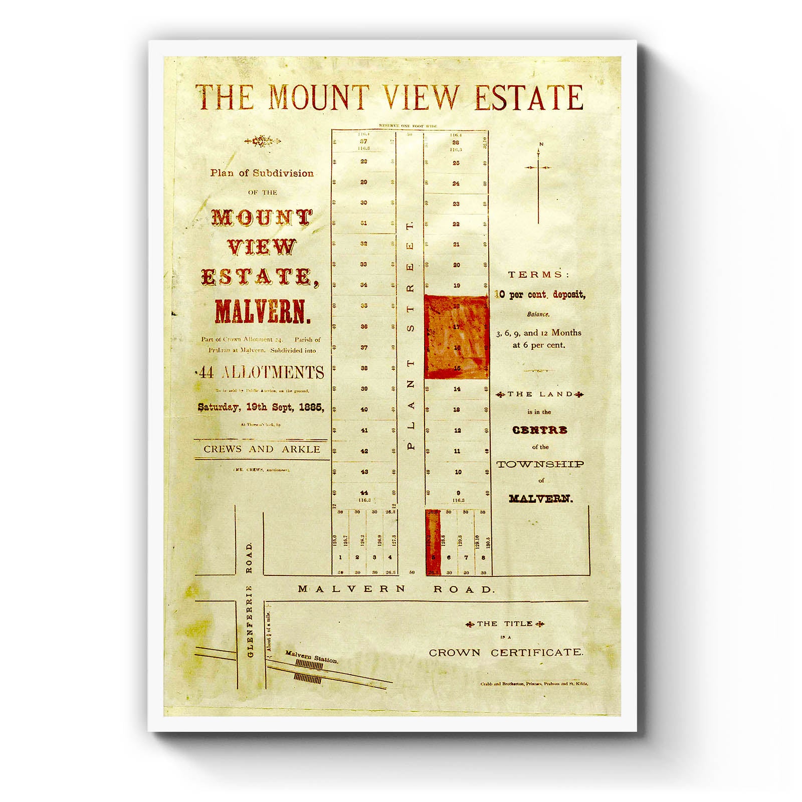 "To be sold by public auction on the ground, Saturday, 19th Sept., at three o'clock, by Crews and Arkle."; "Part of crown allotment 24. Parish of Prahran at Malvern."