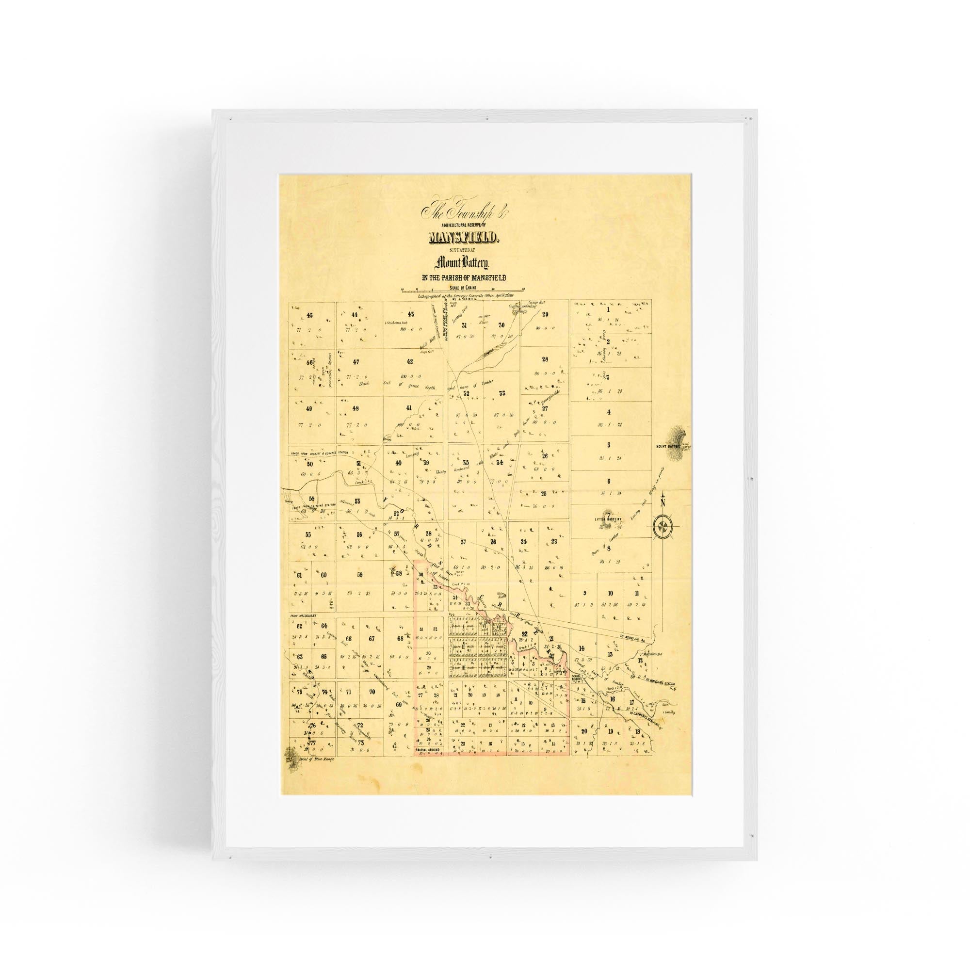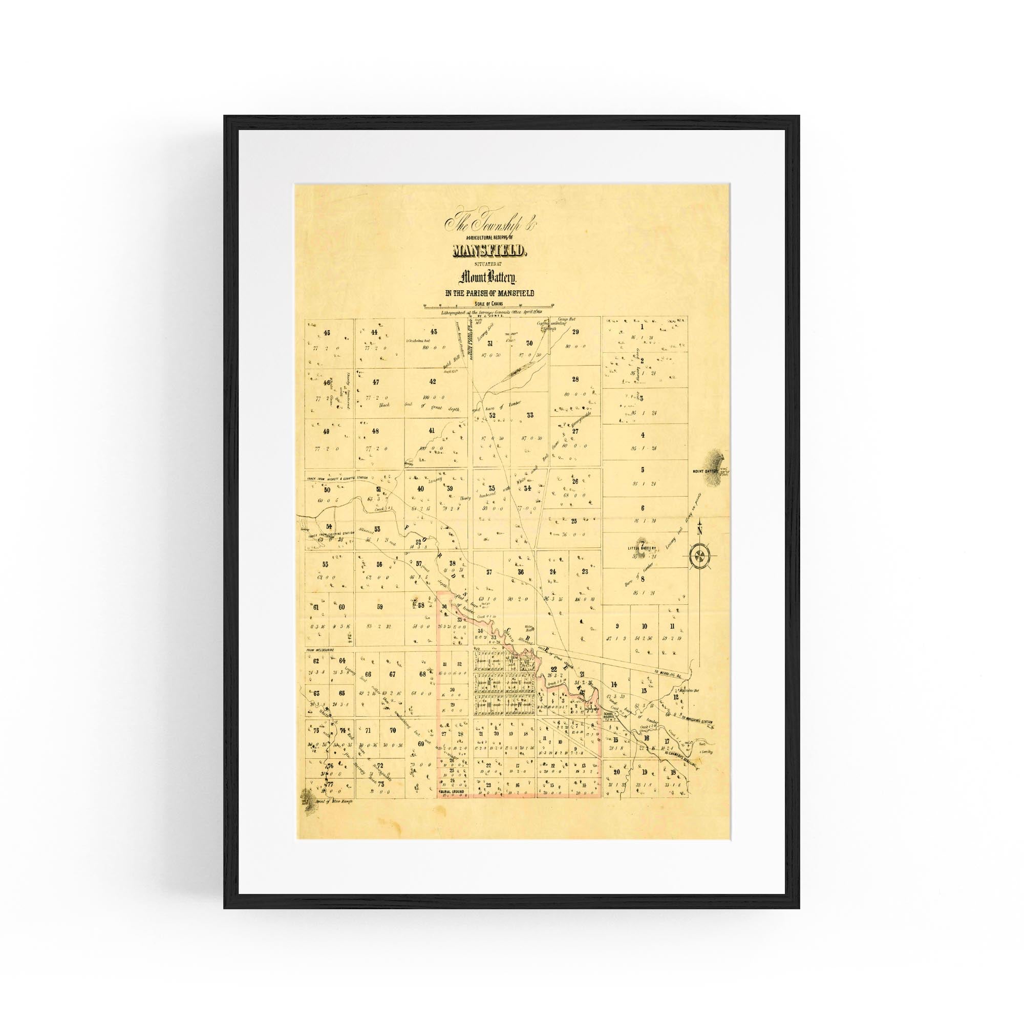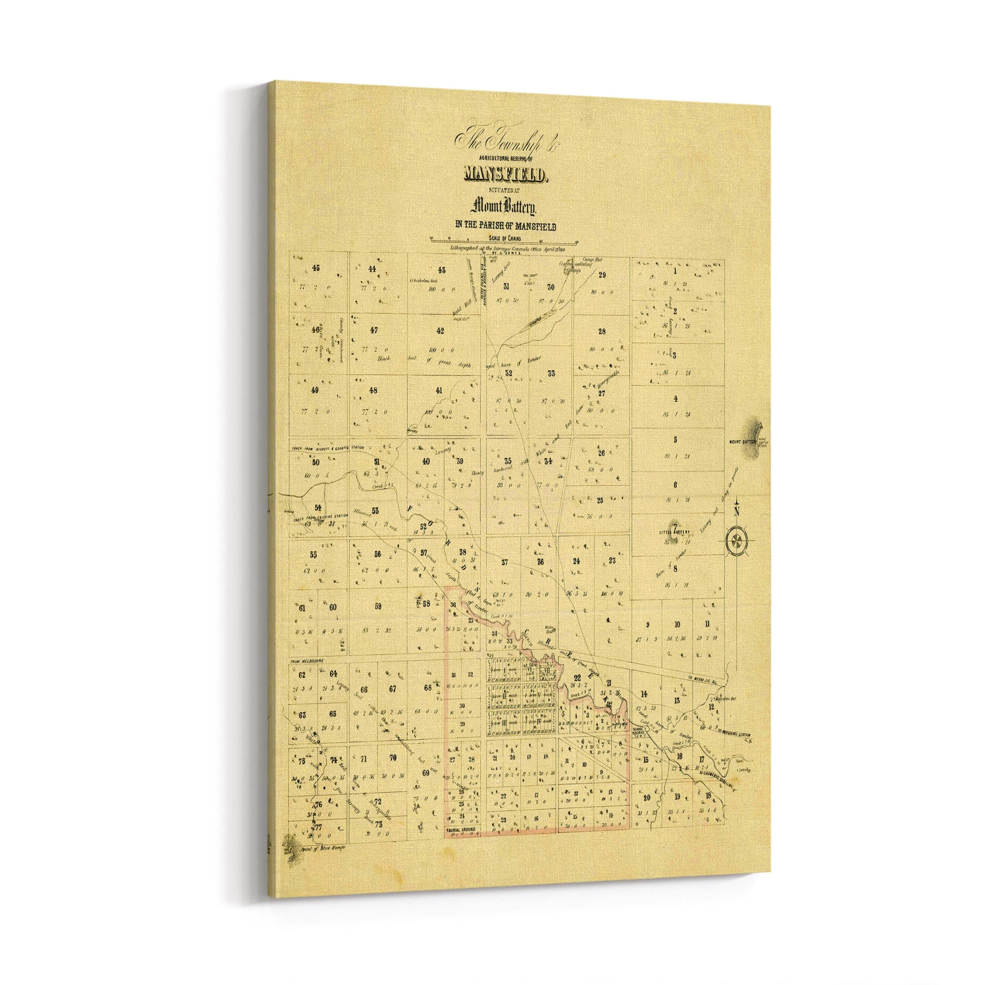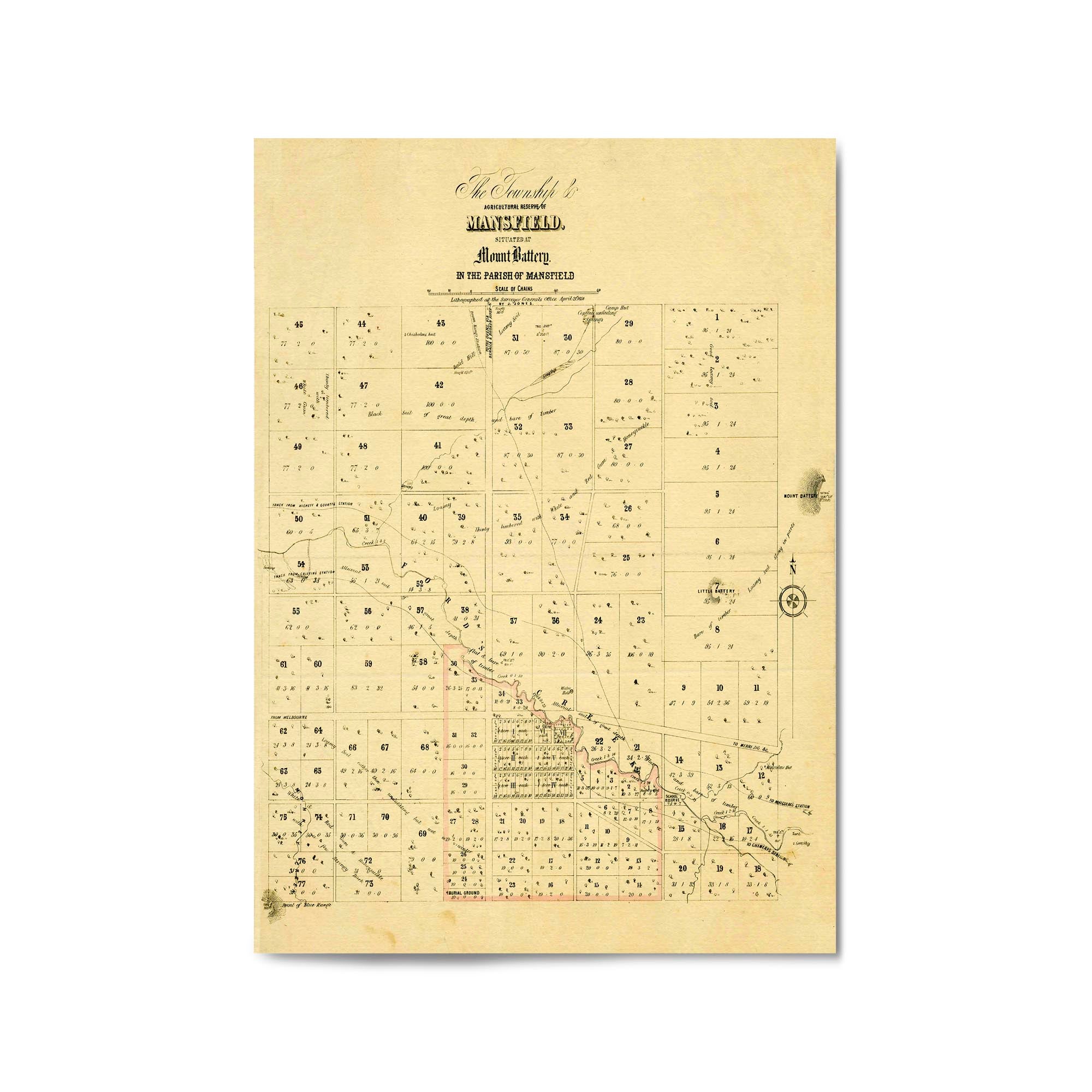 The Township & agricultural reserve of Mansfield, situated at Mount Battery in the Parish of Mansfield. Lithographed at the Surveyor General's Office, April 21st, 1854.