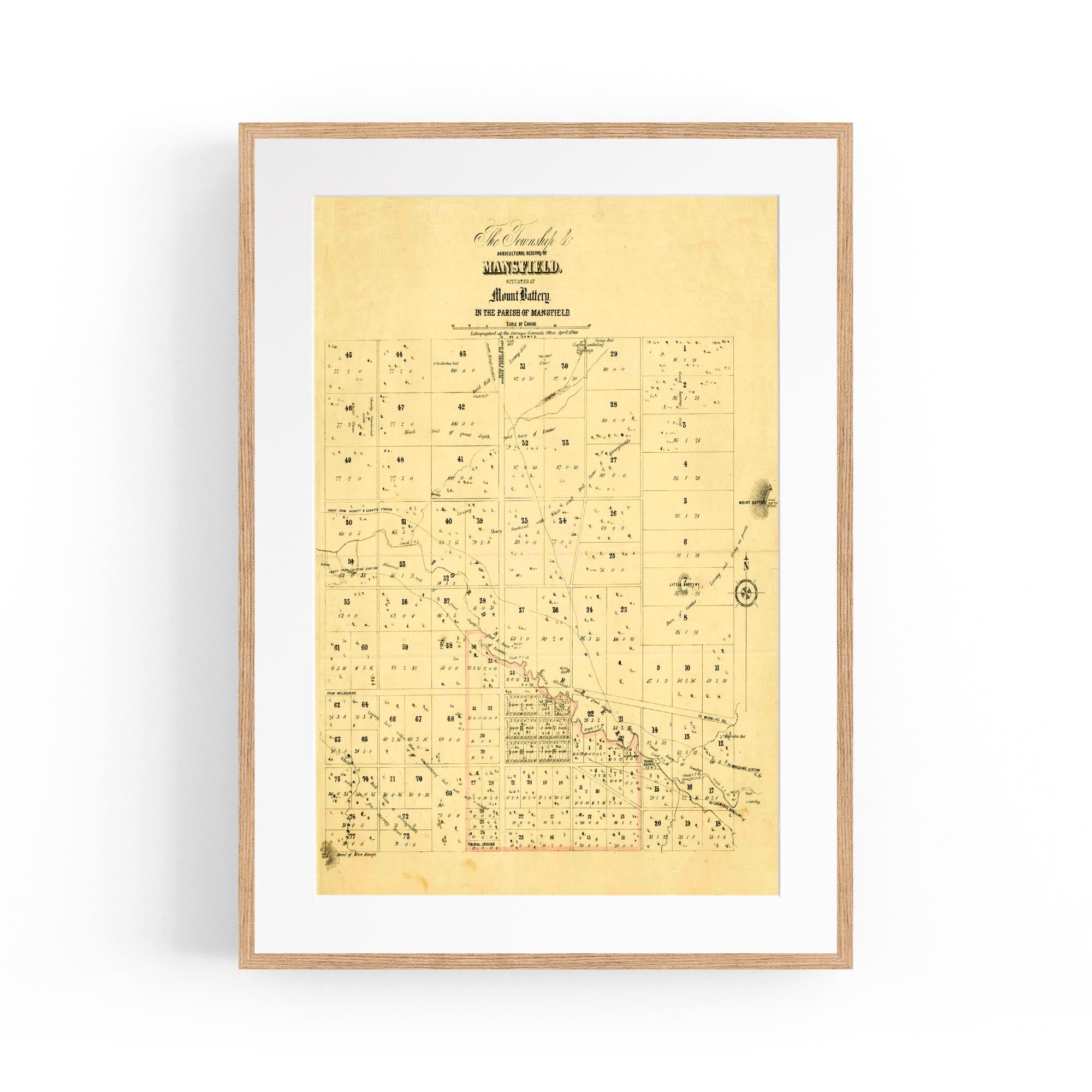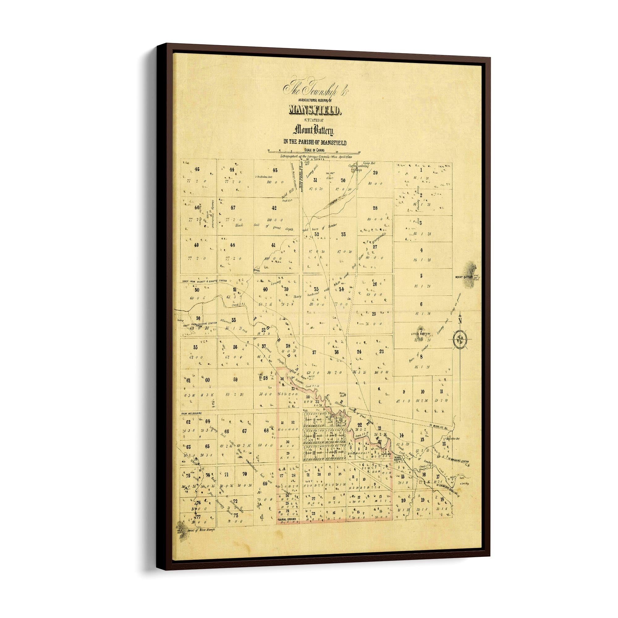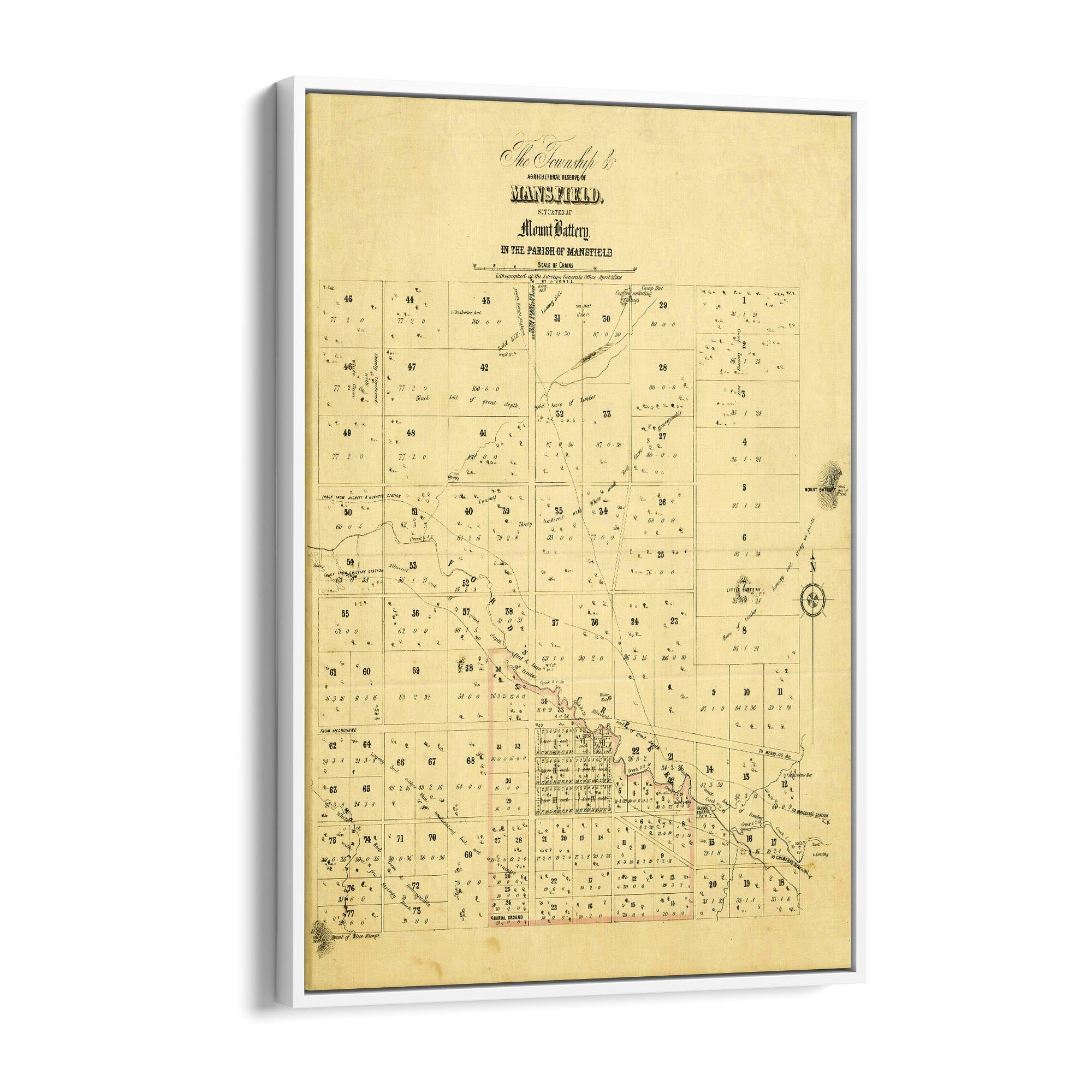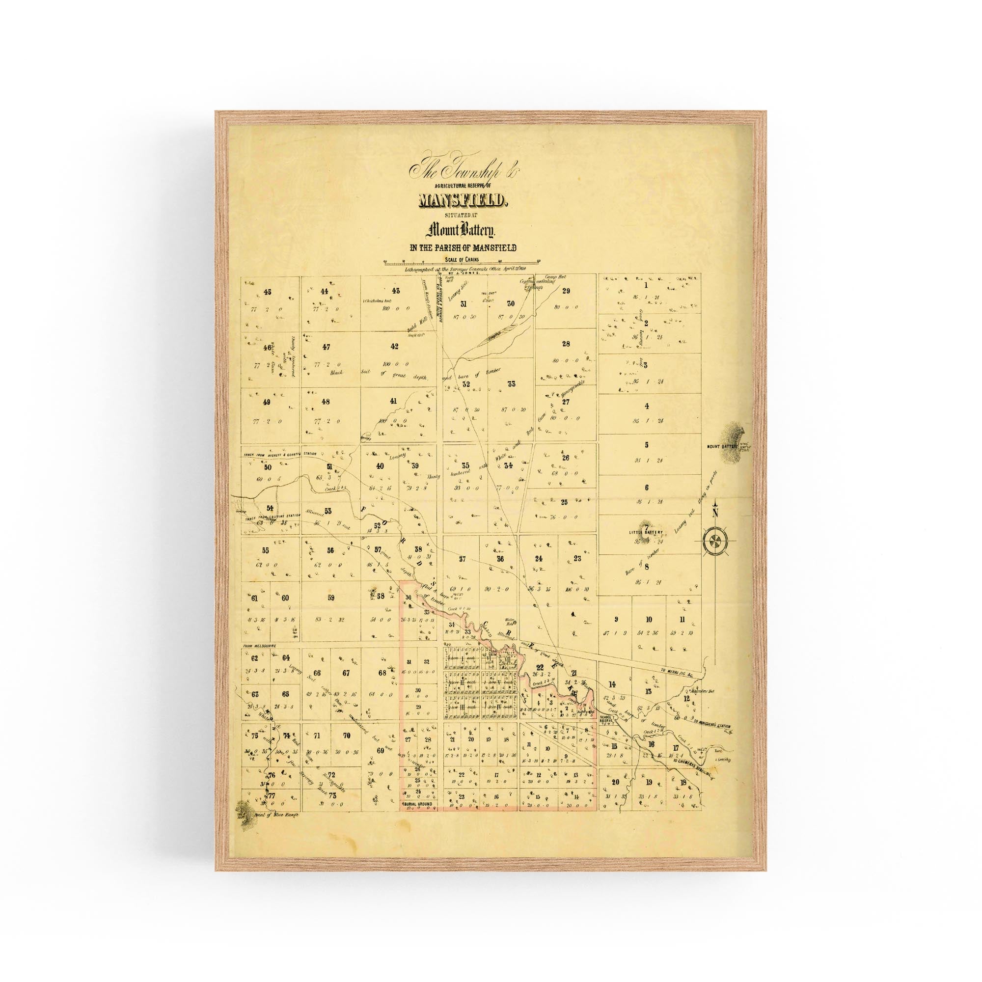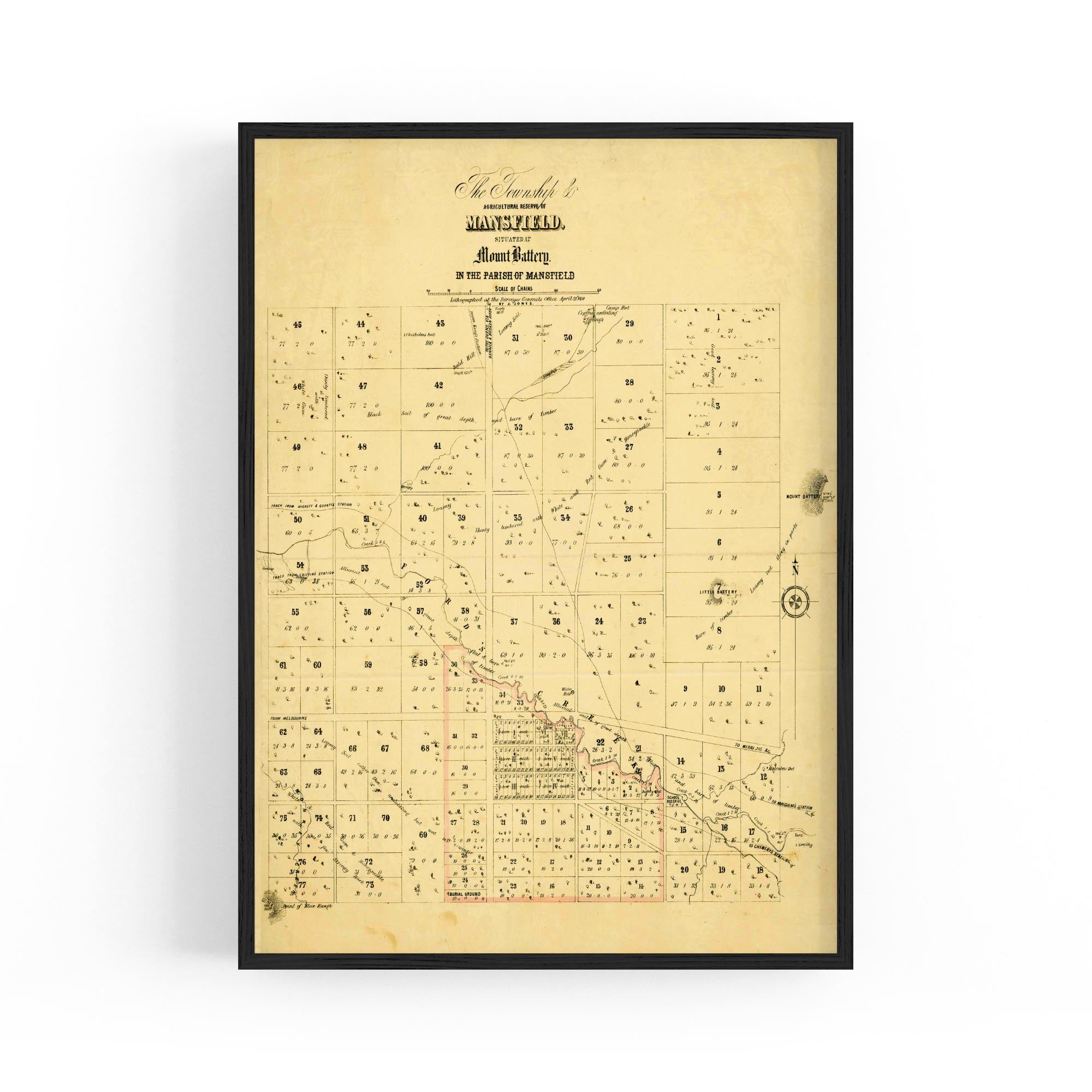 The Township & agricultural reserve of Mansfield, situated at Mount Battery in the Parish of Mansfield. Lithographed at the Surveyor General's Office, April 21st, 1854.