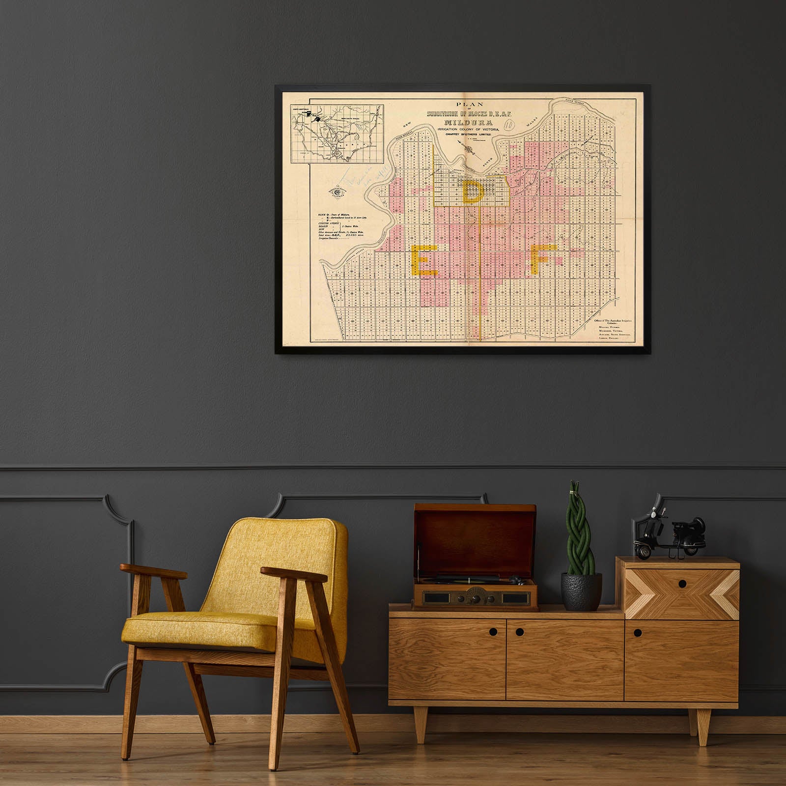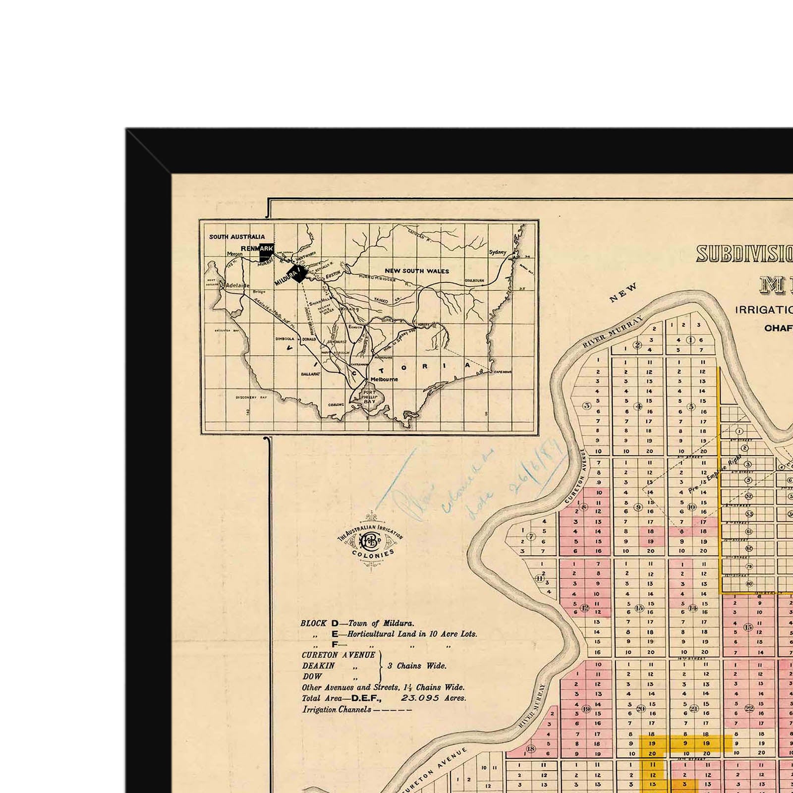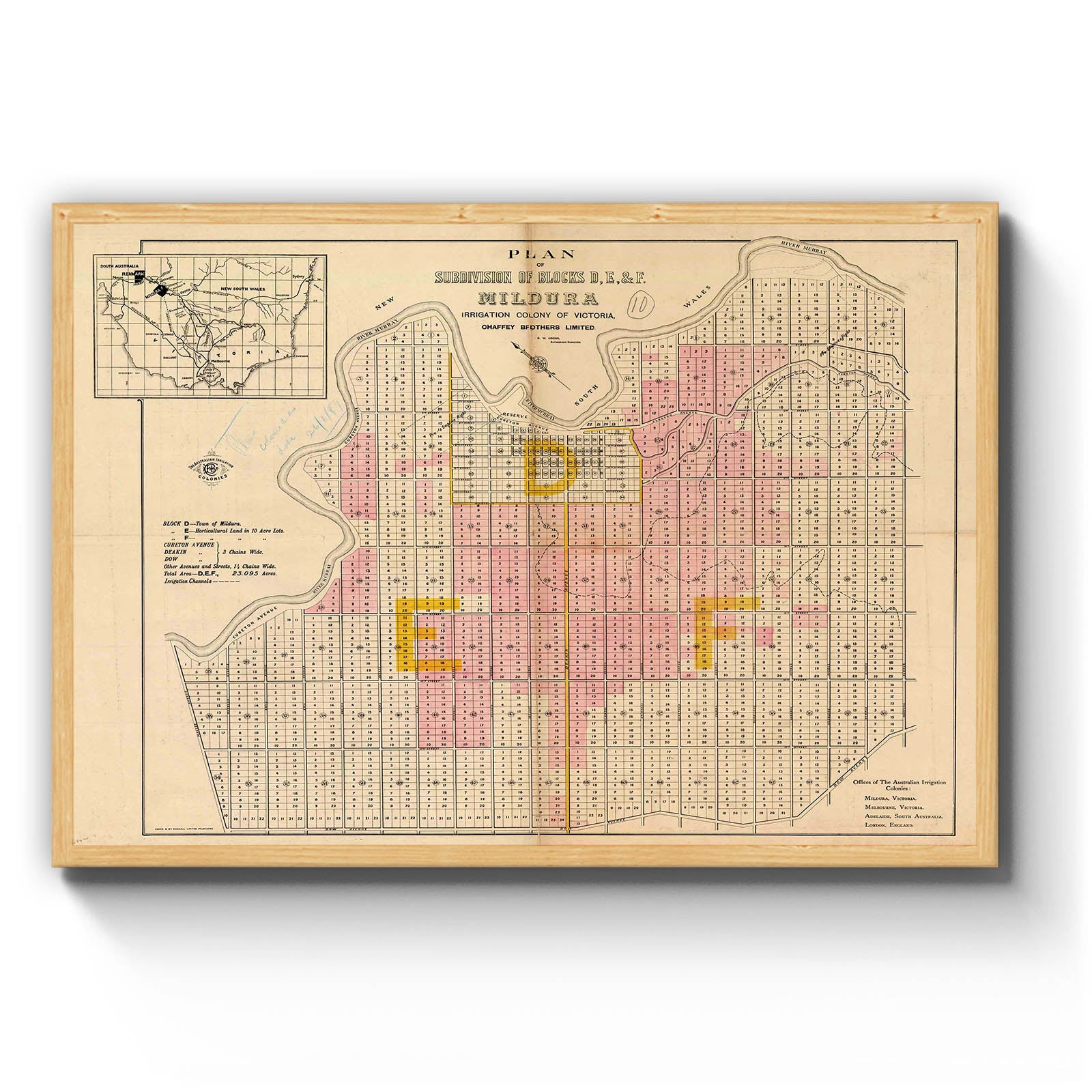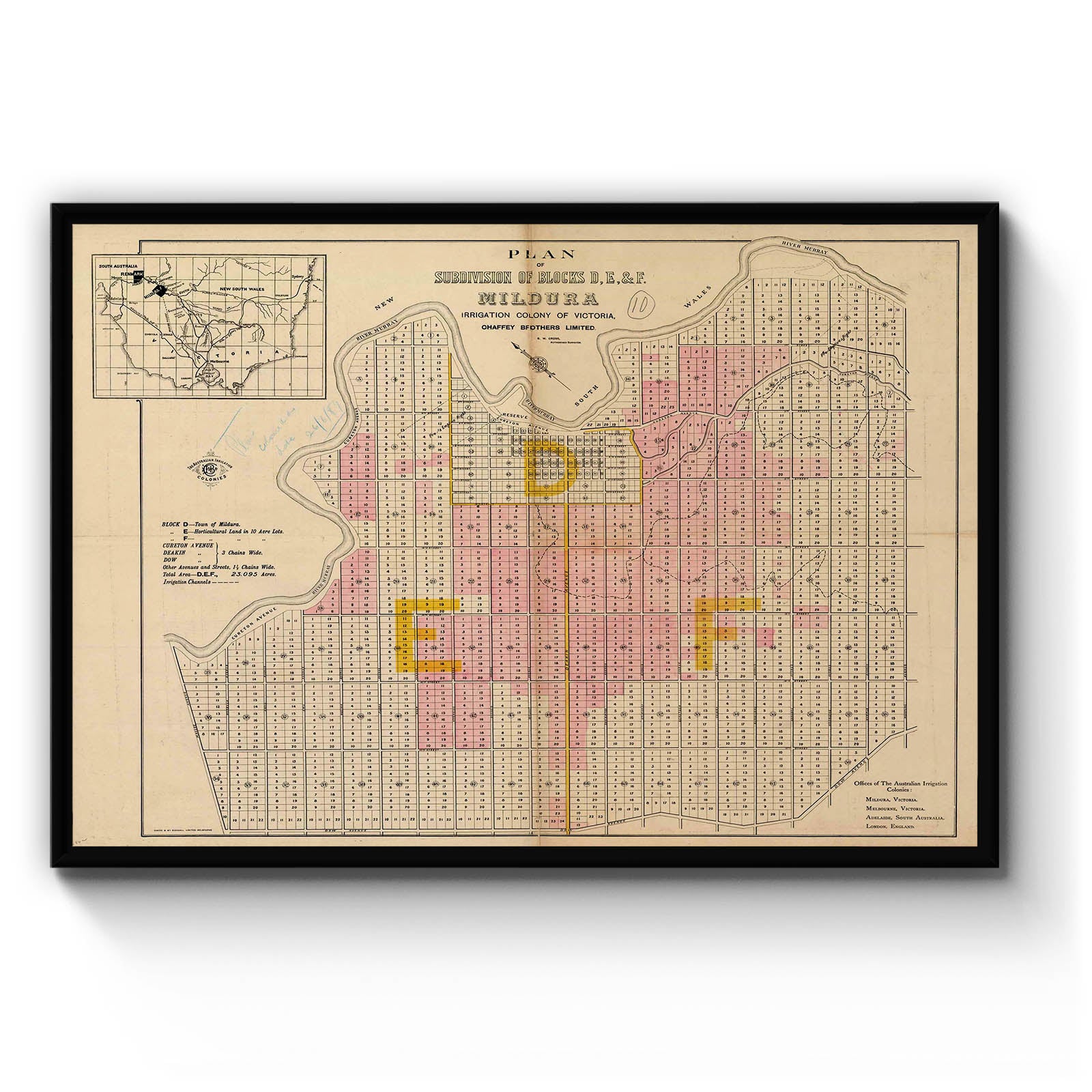 Plan of subdivision of blocks D, E, & F. Mildura, irrigation colony of Victoria [cartographic material] / Chaffey Brothers Limited. [188-?]