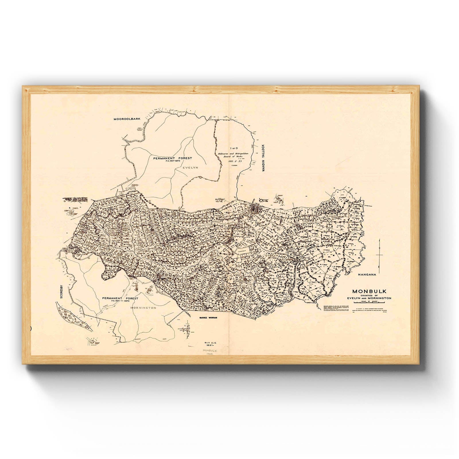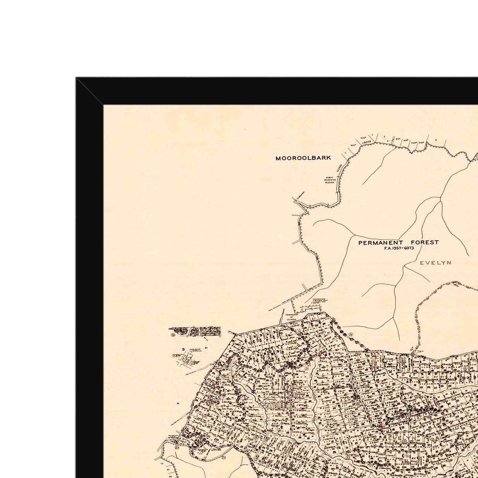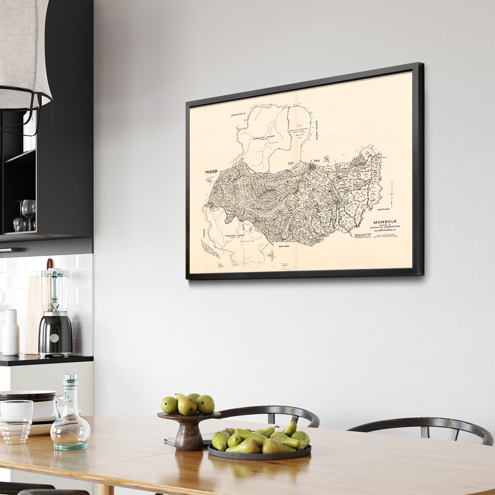 Recently moving to Harcourt and being interested in the history of the area, it seemed fitting to purchase a vintage map of the area which is displayed on our kitchen wall for us to study easily, identifying the block of land we bought. Nicely framed too.