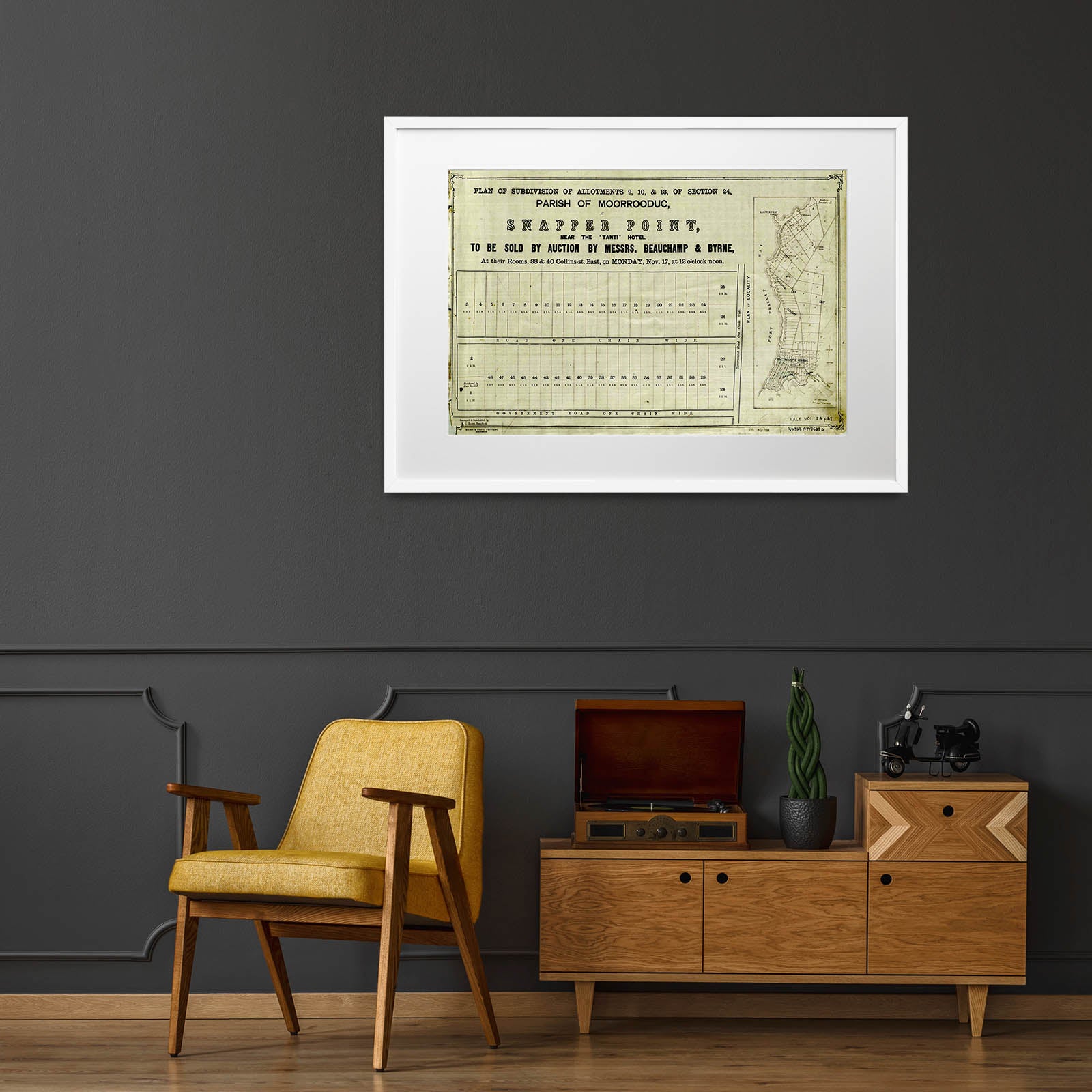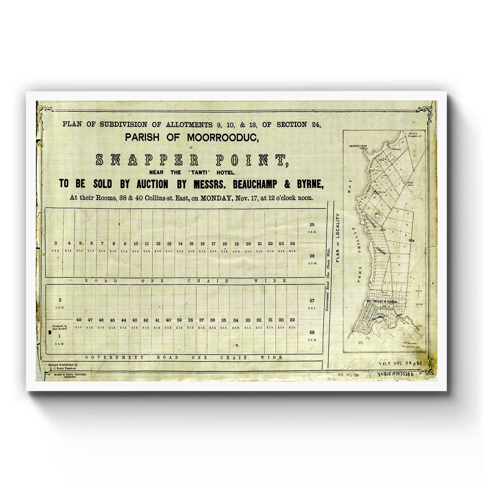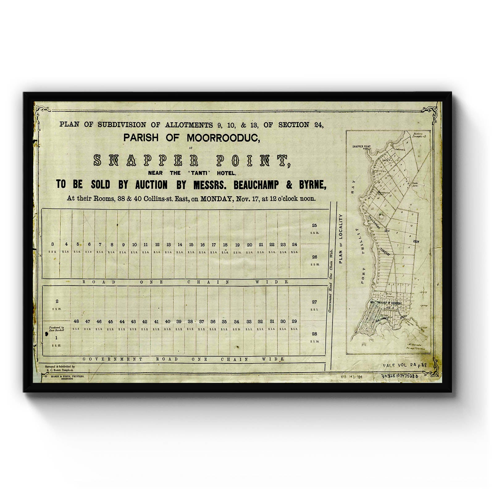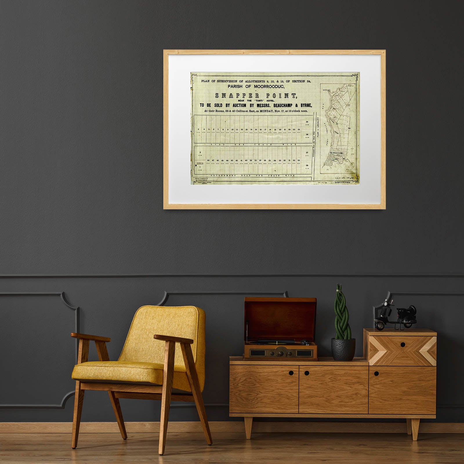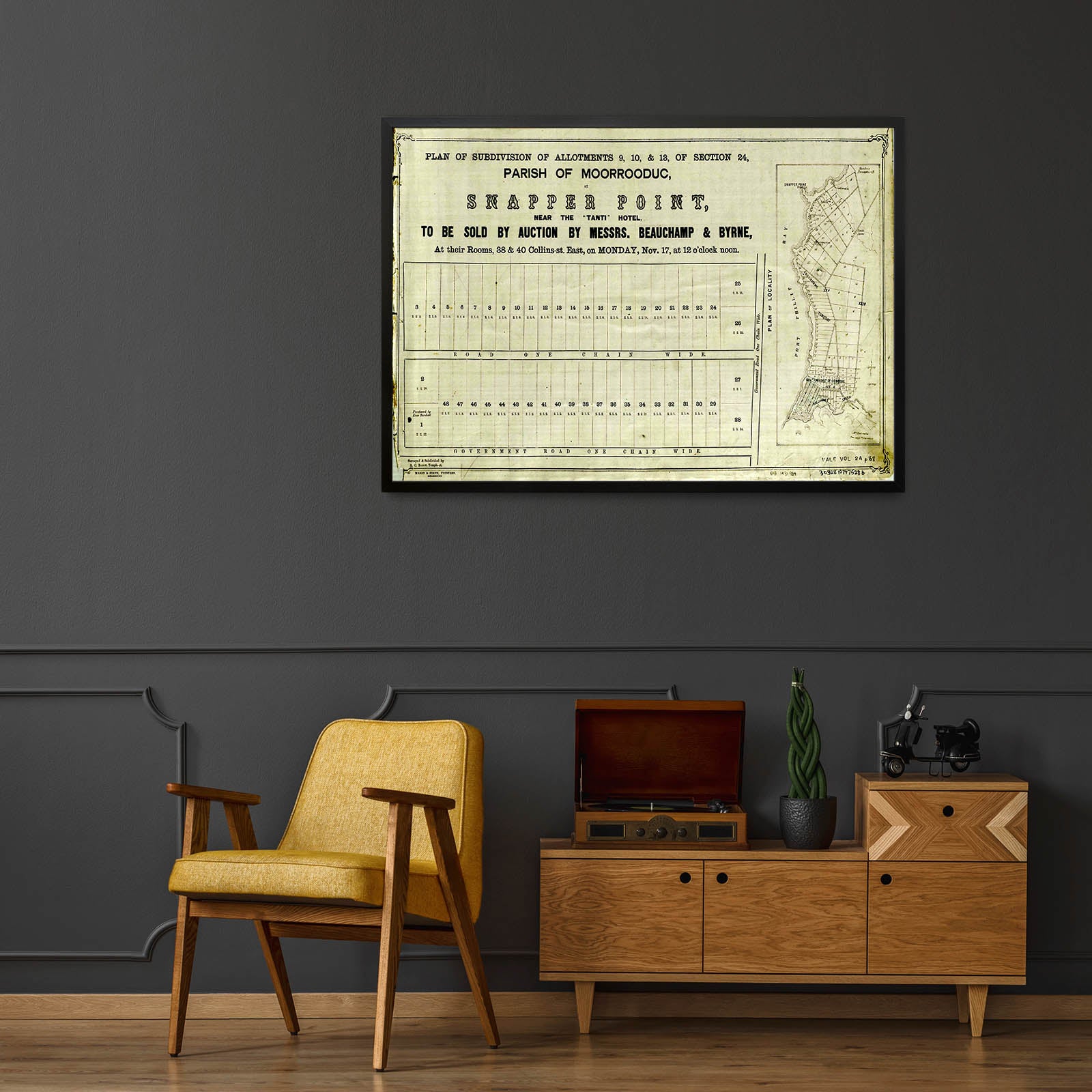 Recently moving to Harcourt and being interested in the history of the area, it seemed fitting to purchase a vintage map of the area which is displayed on our kitchen wall for us to study easily, identifying the block of land we bought. Nicely framed too.