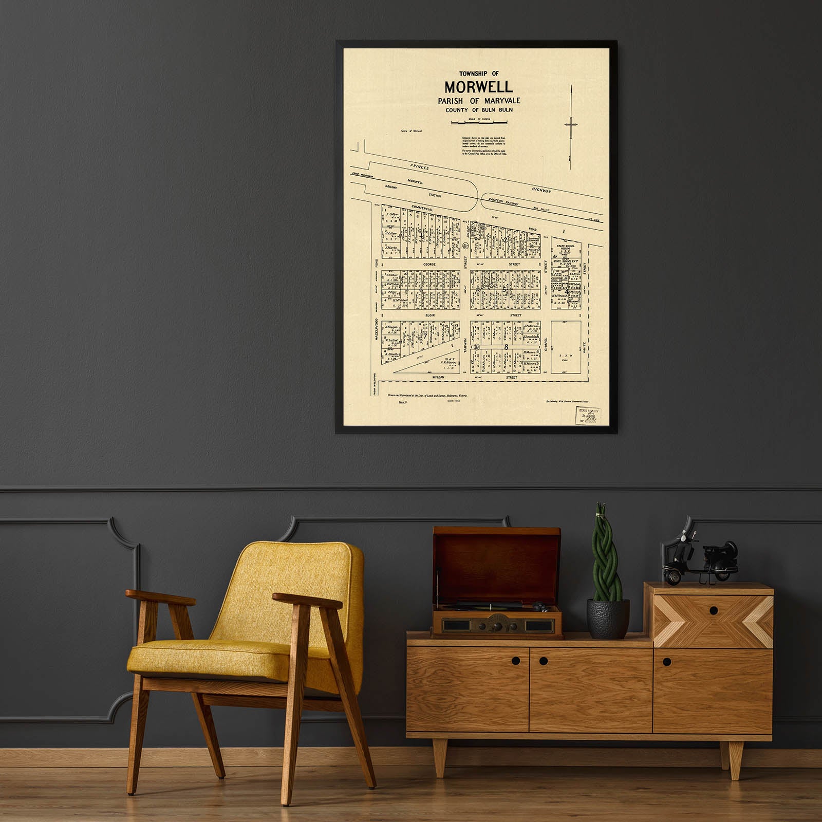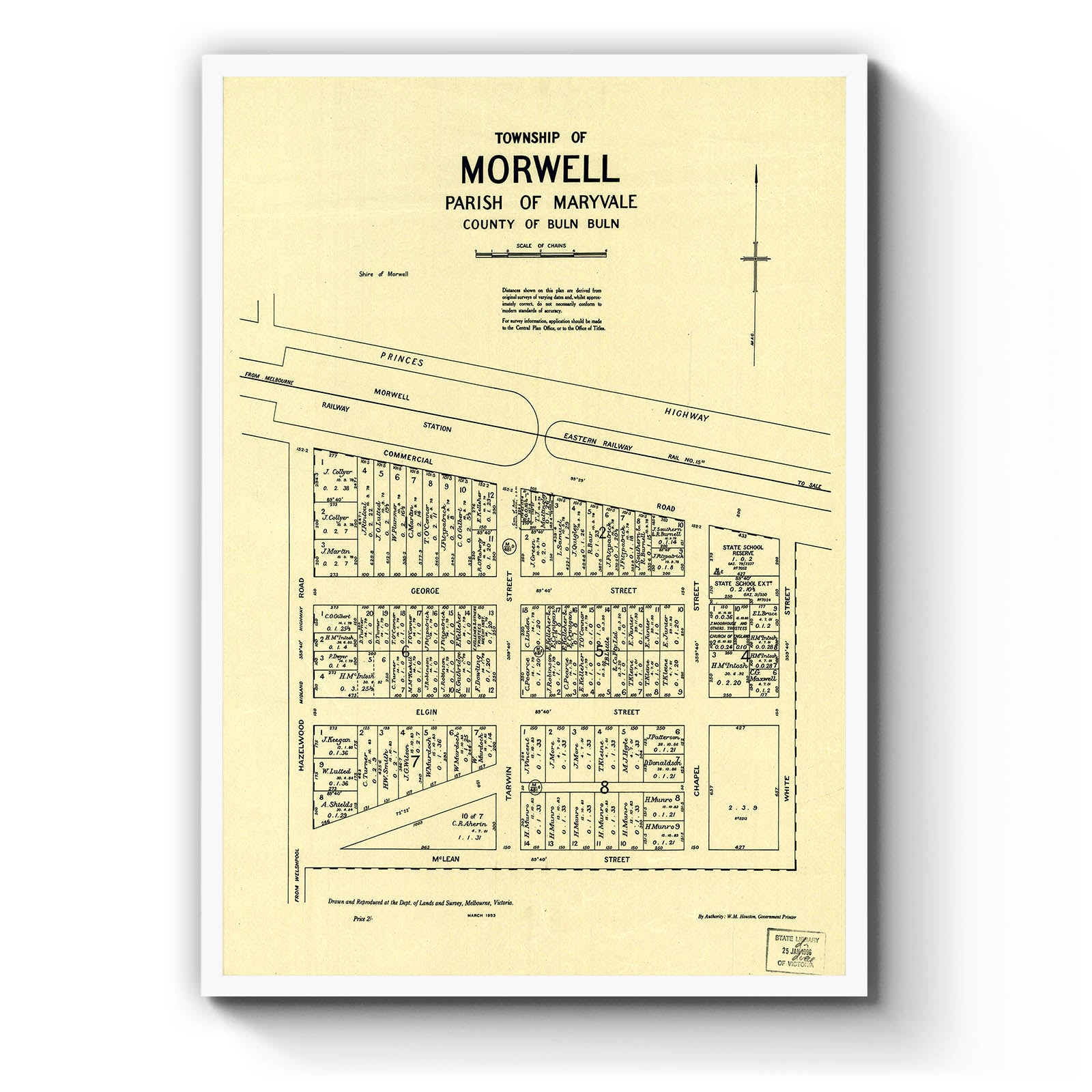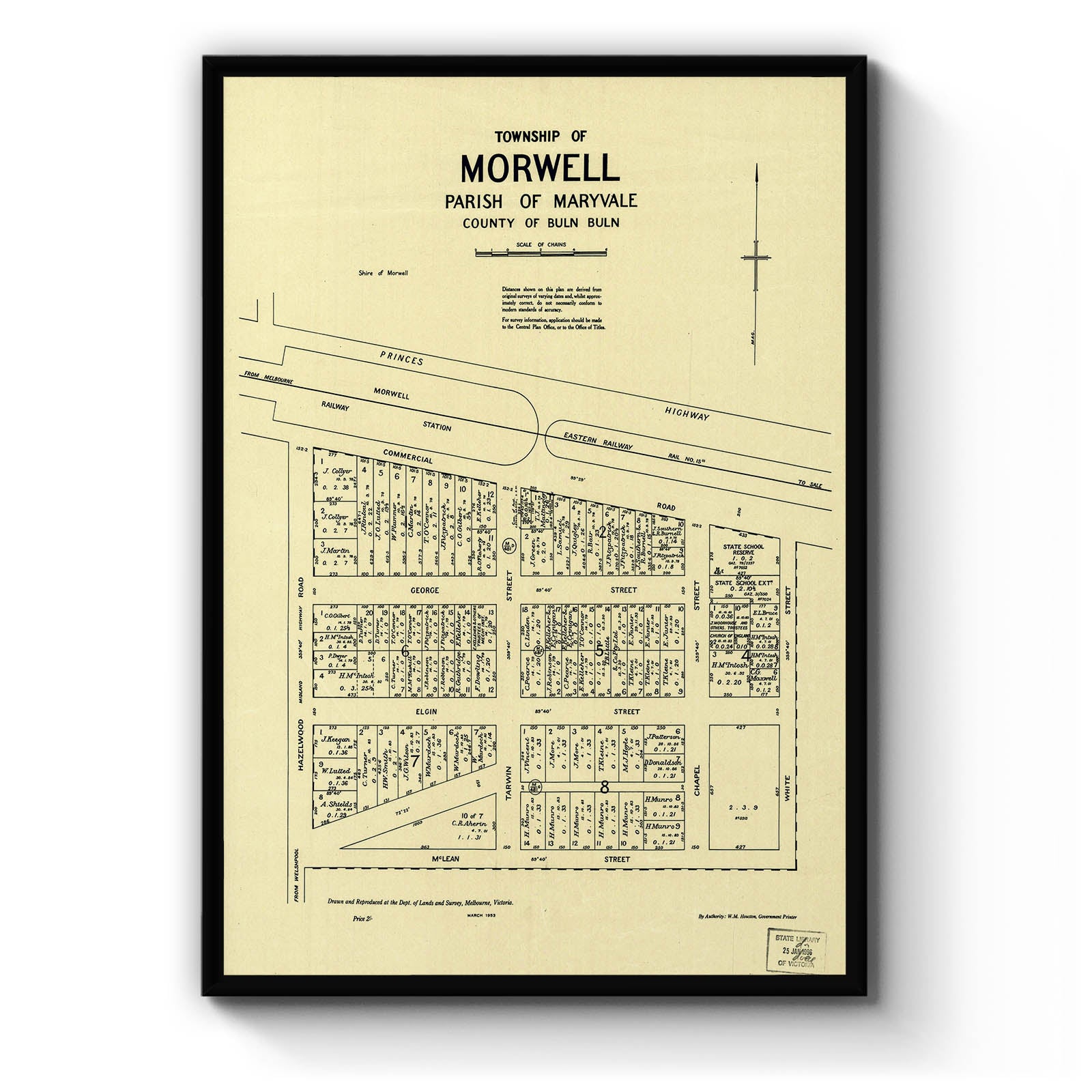 Cadastral town map of Morwell in Victoria, showing landowners.