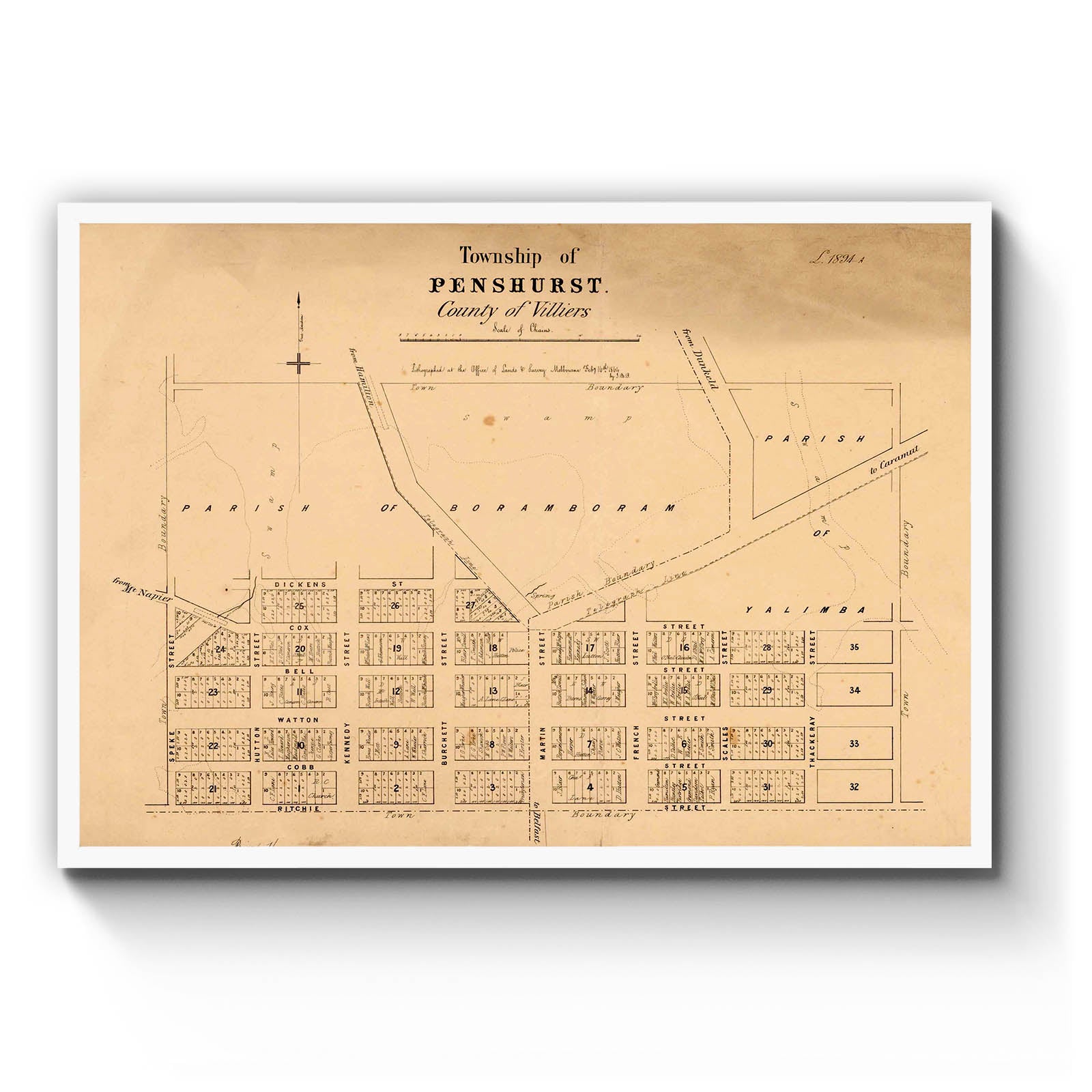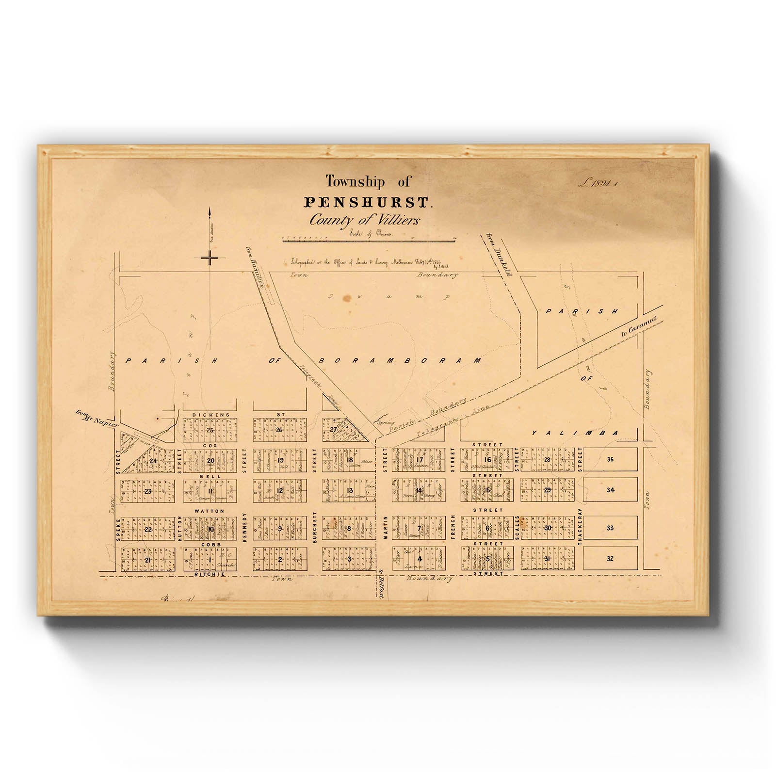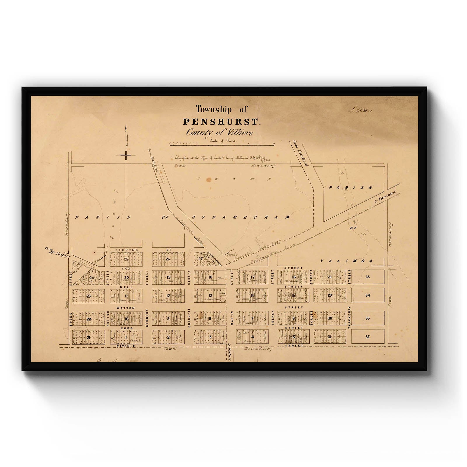 Township of Penshurst, County of Villiers [cartographic material] / lithographed at the Office of Lands and Survey, Melbourne, Feby 16th 1864, by J. B. P. 1864.