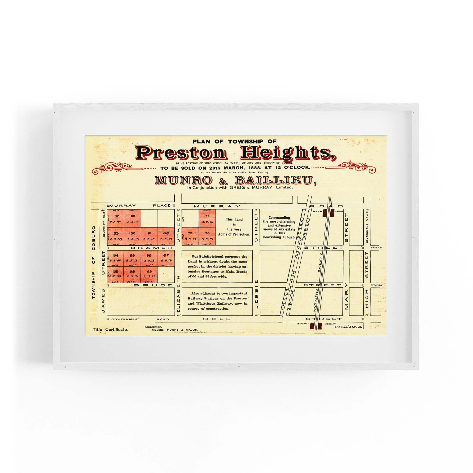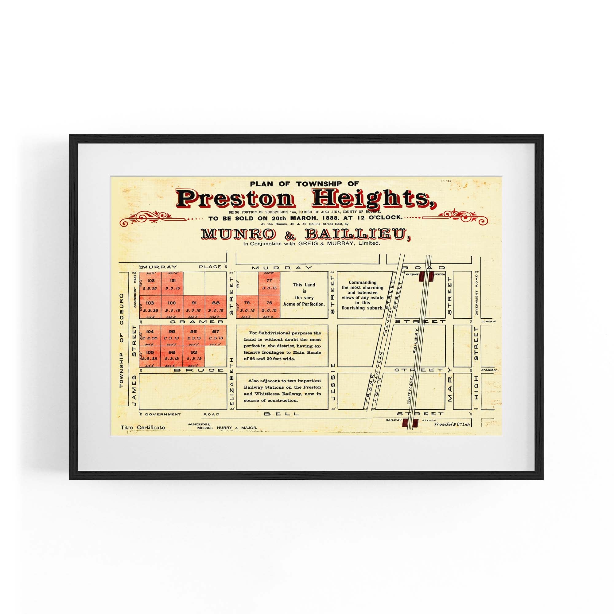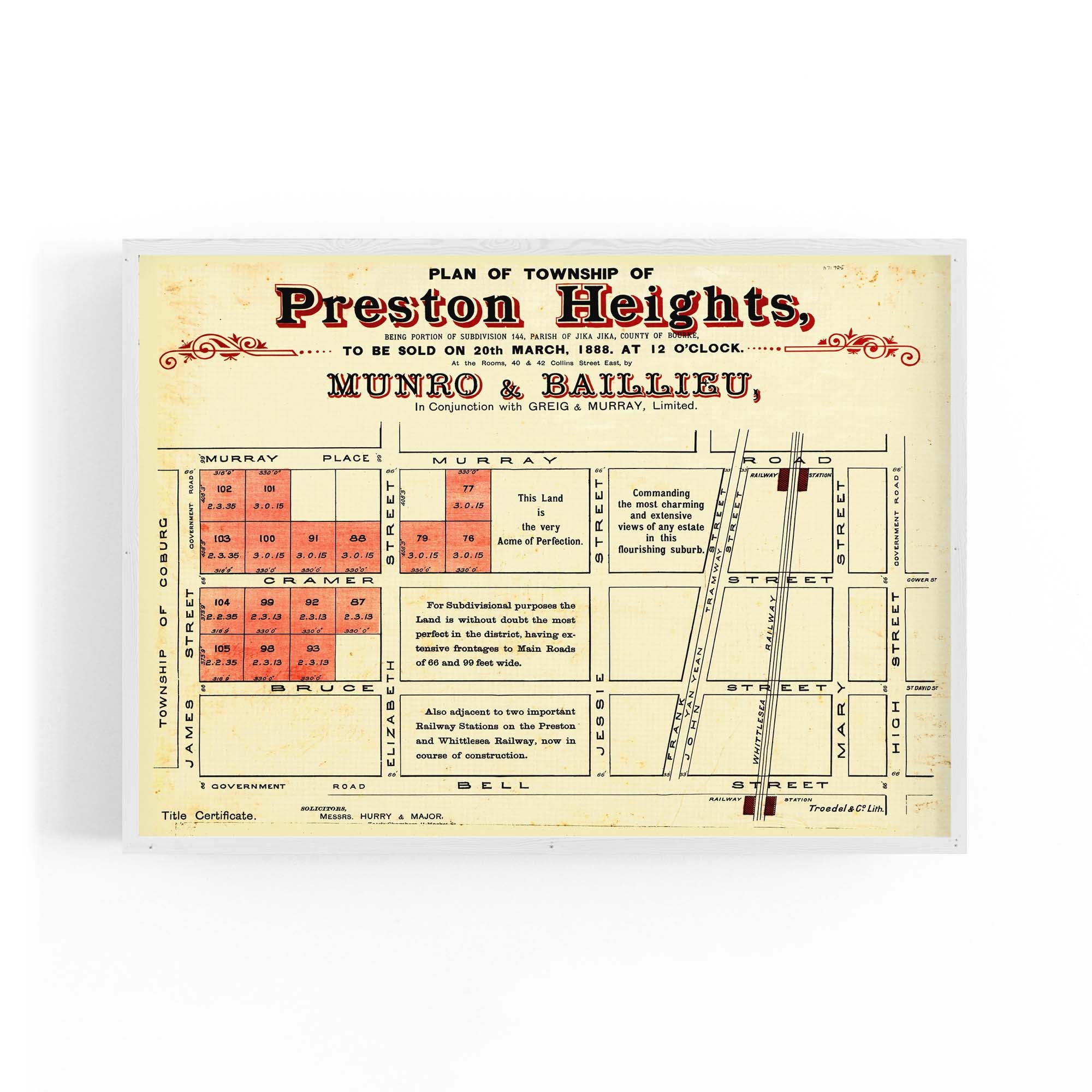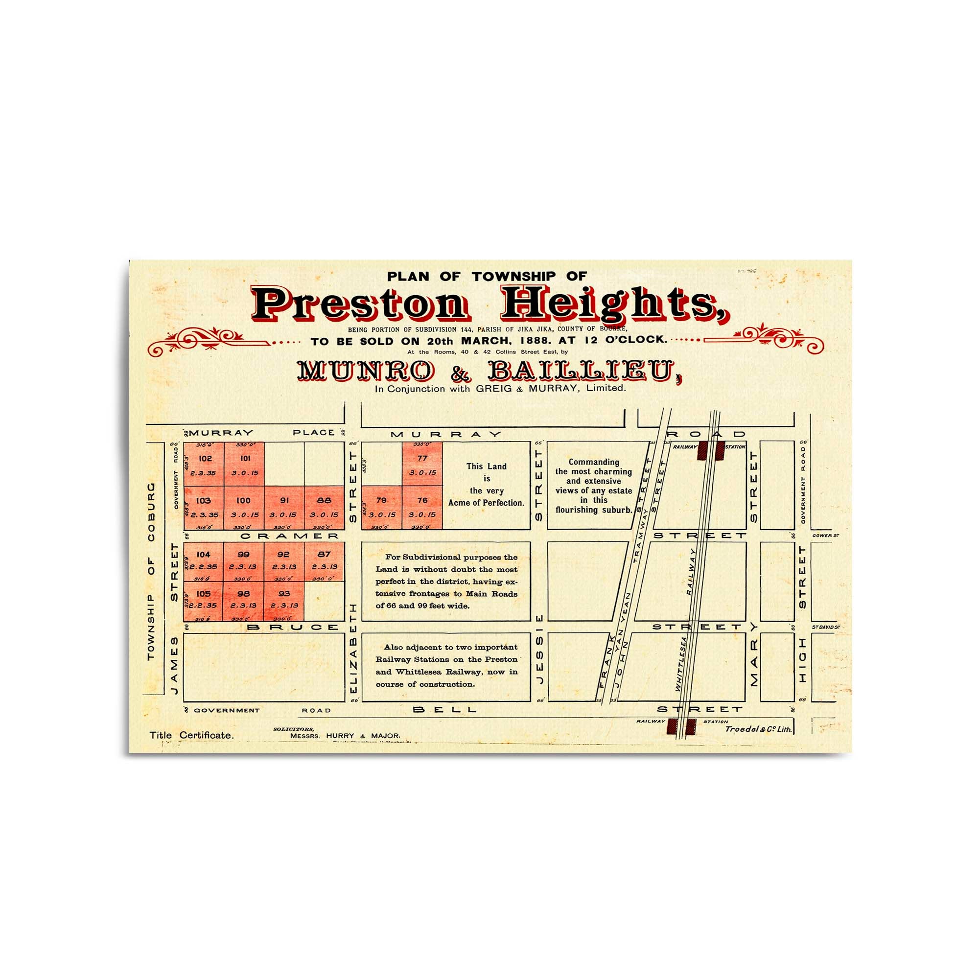 1888 Vintage Map of Preston, Victoria Australia