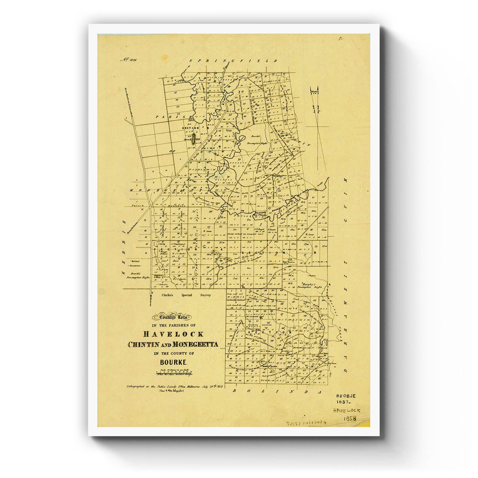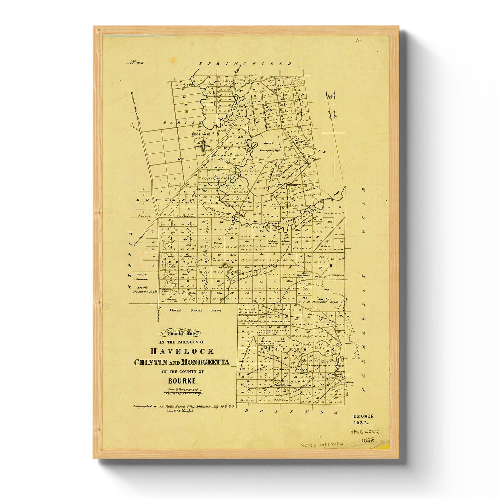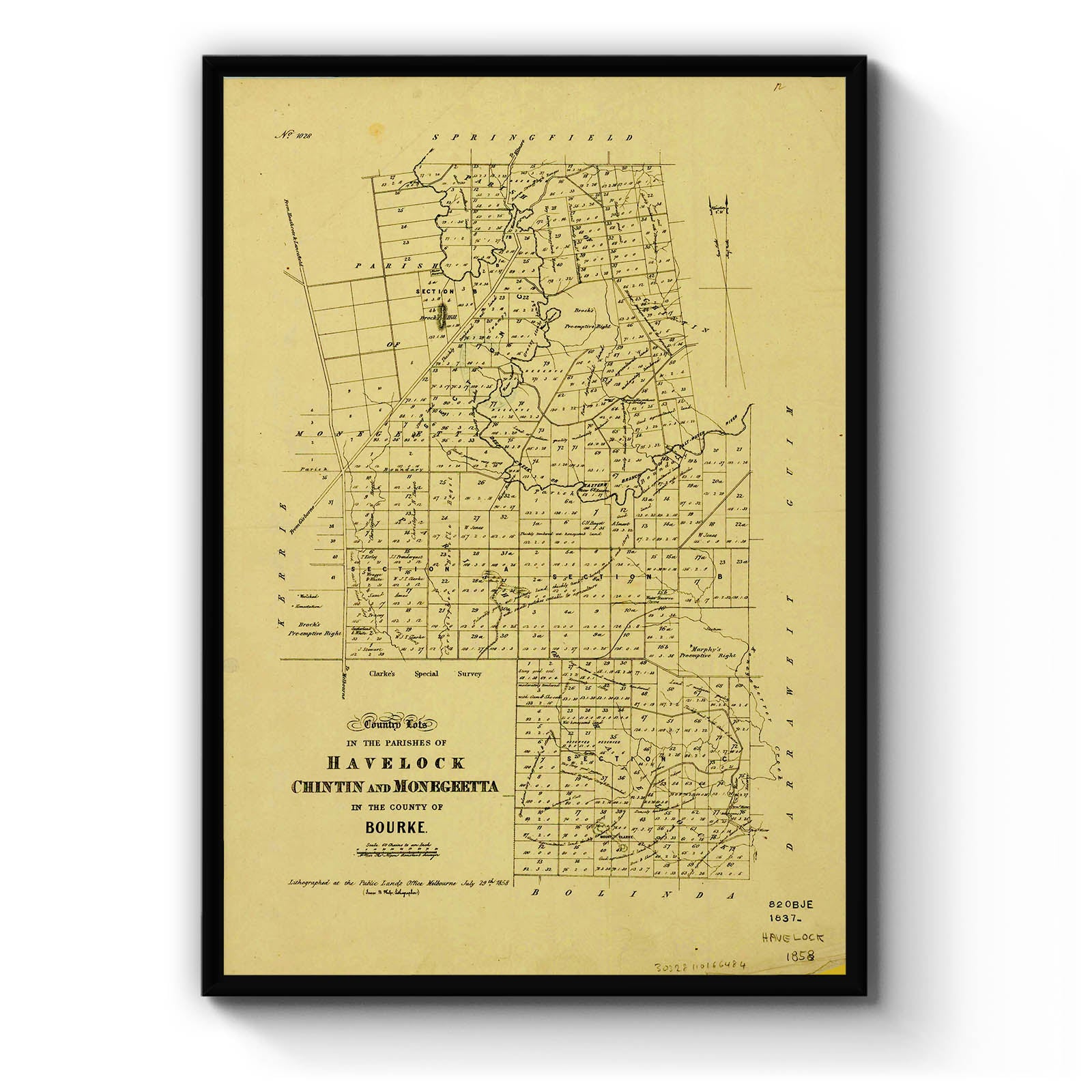 Country lots in the Parishes of Havelock, Chintin and Monegeeta in the County of Bourke [cartographic material] / lithographed at the Public Lands Office, Melbourne, July 29th 1858 (James B. Philp, lithographer). 1858