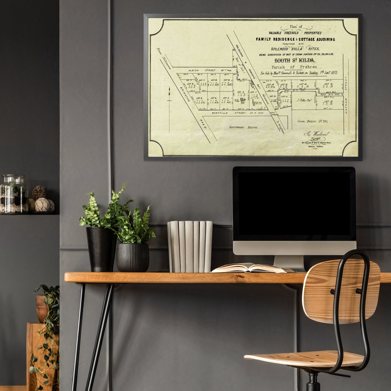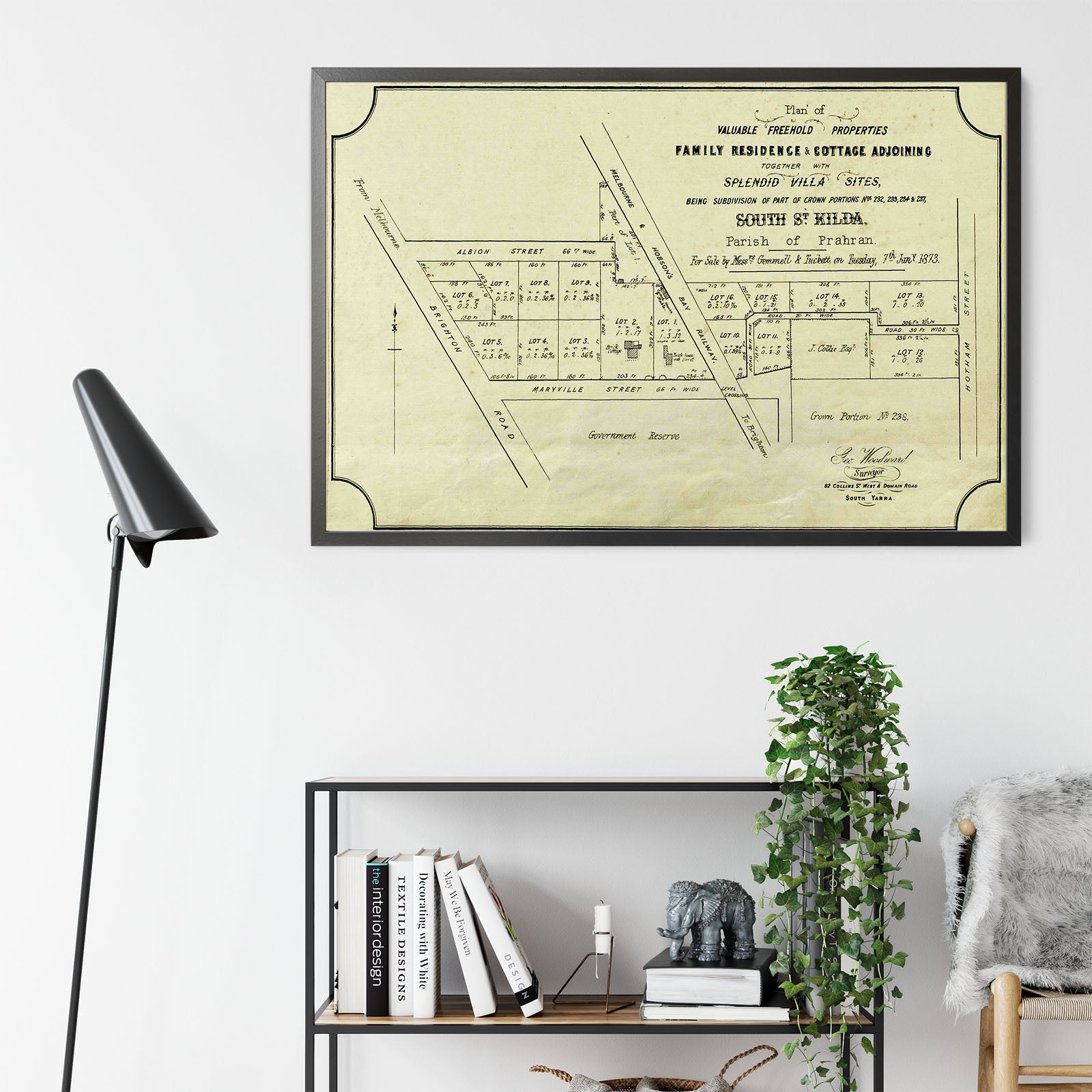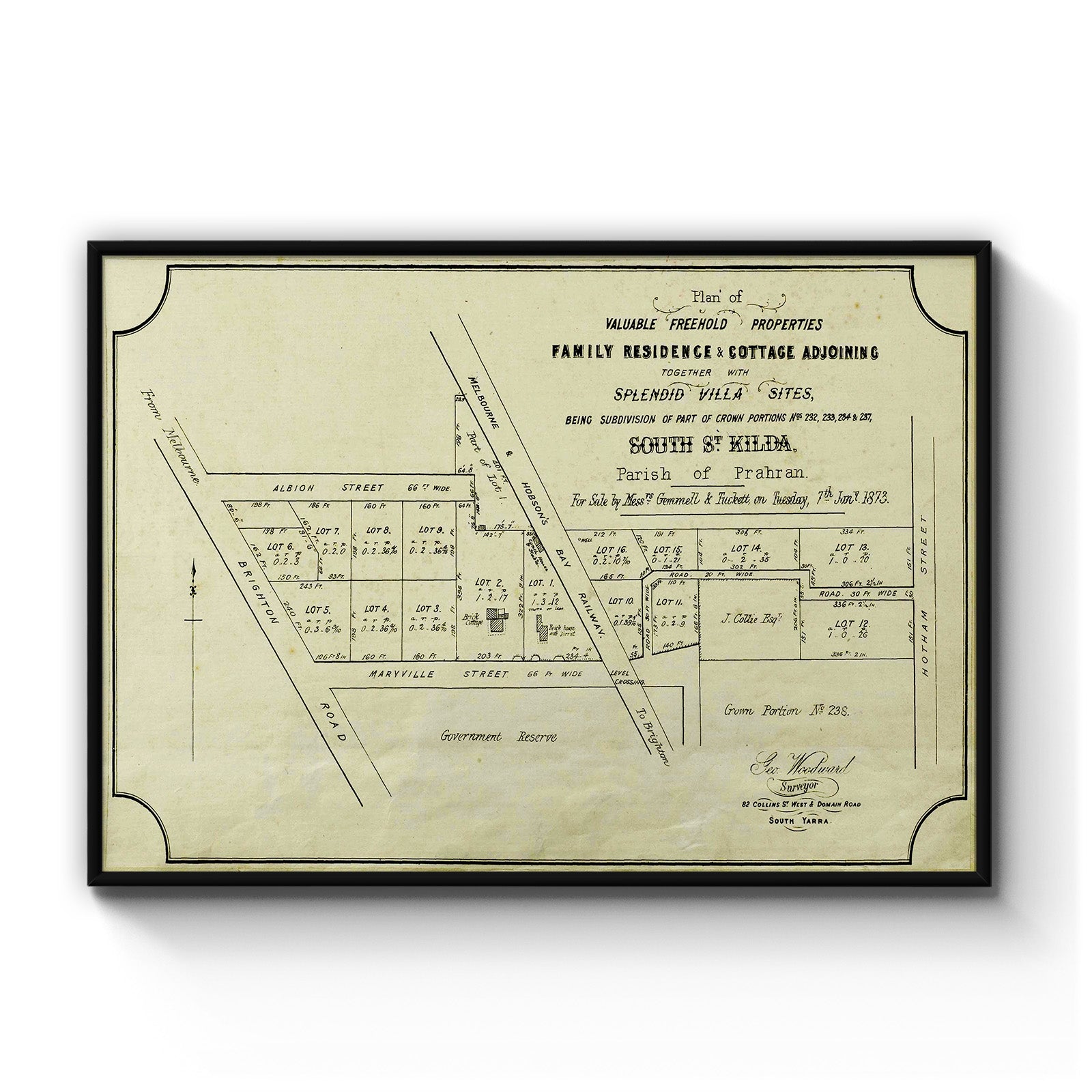 Plan of valuable freehold properties, family residence & cottage Adjoining together with splendid villa sites, being subdivision of part of Crown portions nos. 232, 233,234 & 237, South St. Kilda, Parish of Prahran [cartographic material]./ Geo. Woodward, Surveyor, [Melbourne]. 1873