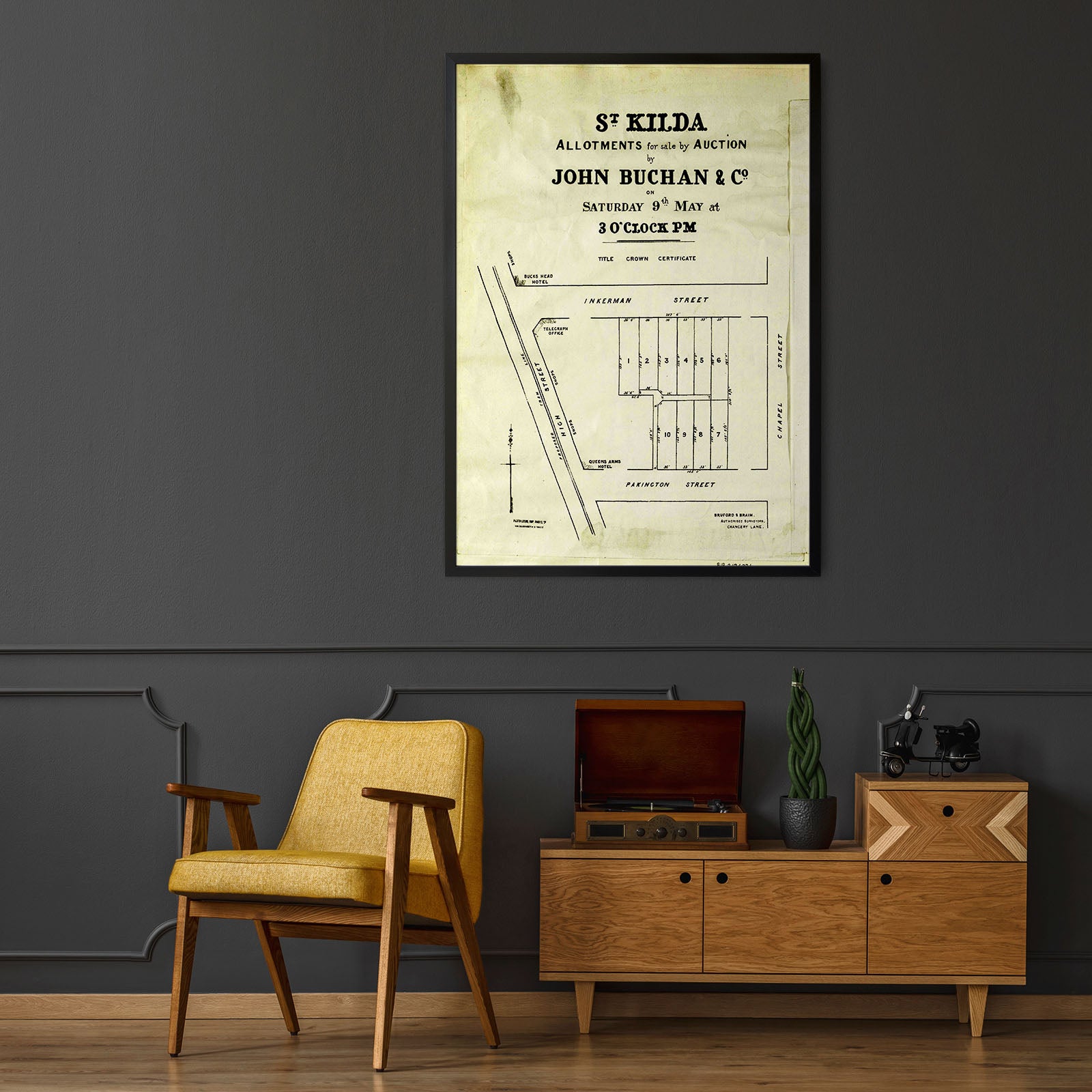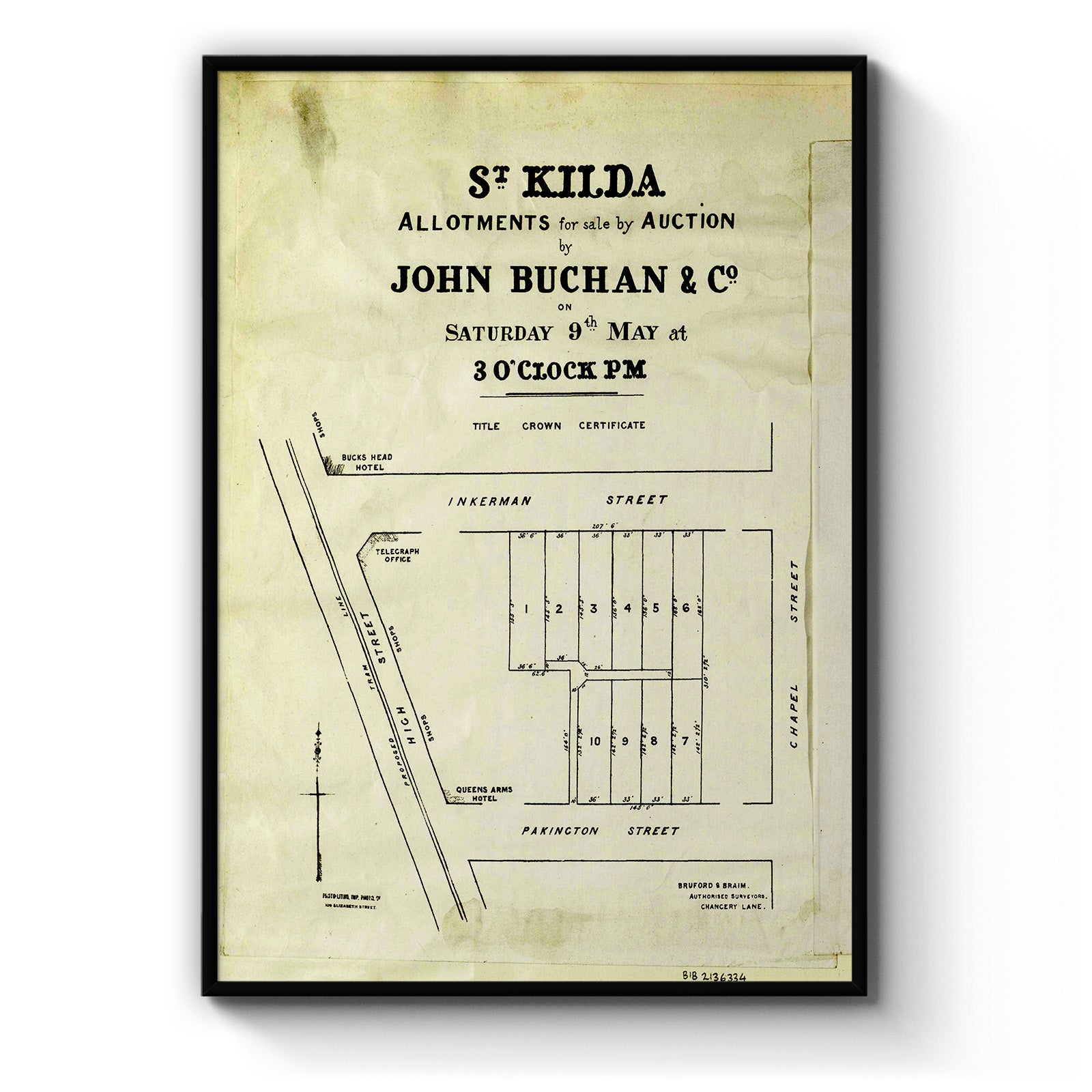 St. Kilda [cartographic material]. [between 1860 and 1880] "Allotments for sale by auction by John Buchan & Co. on Saturday 9th May at 3 o'clock pm."; "Bruford & Braim, authorised surveyors, Chancery Lane."
