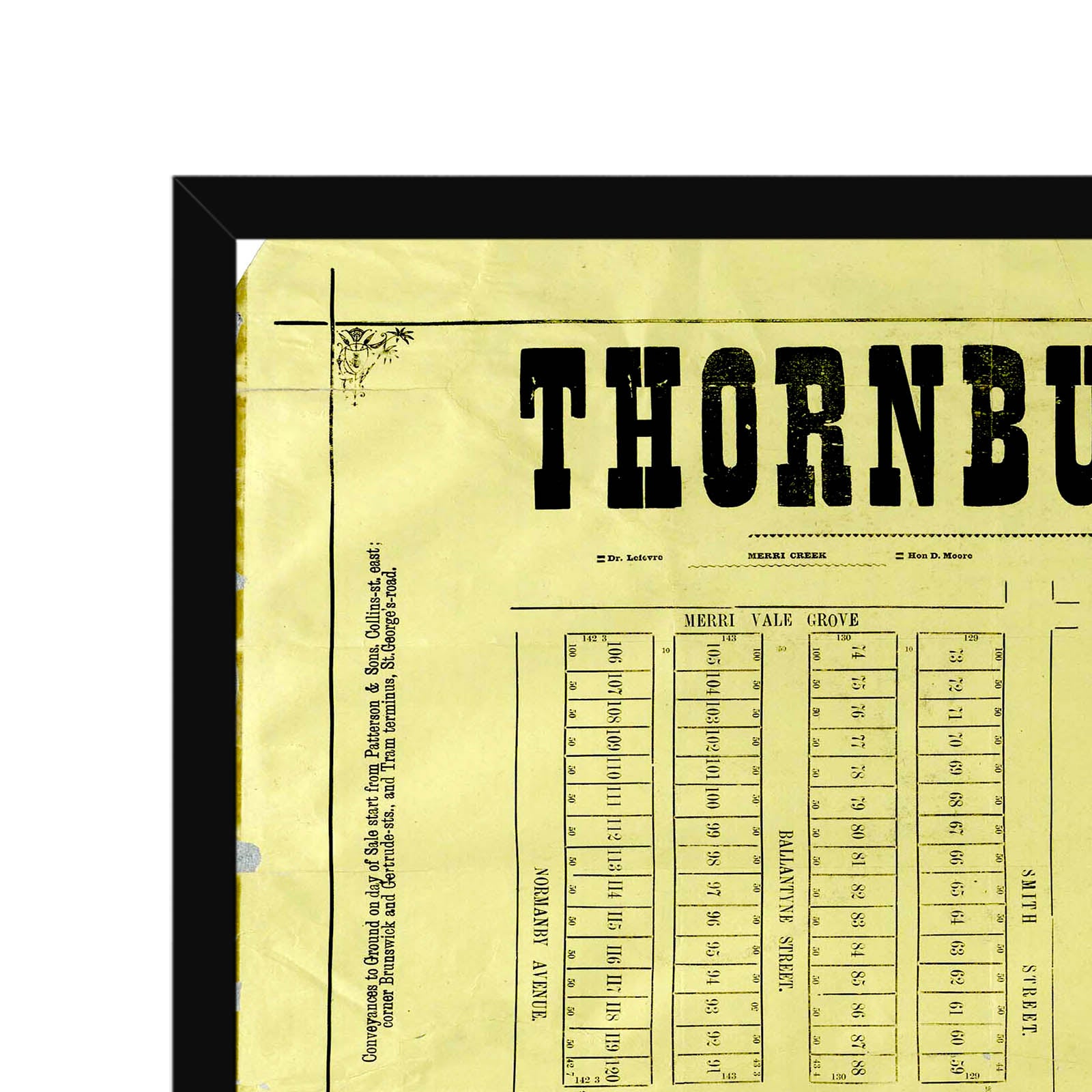 Merri Vale Grove -- Smith Street -- Leinster Grove -- Normanby Avenue -- Ballantyne Street. Also shows the locations of Dr. Lefevre and Hon D. Moore.