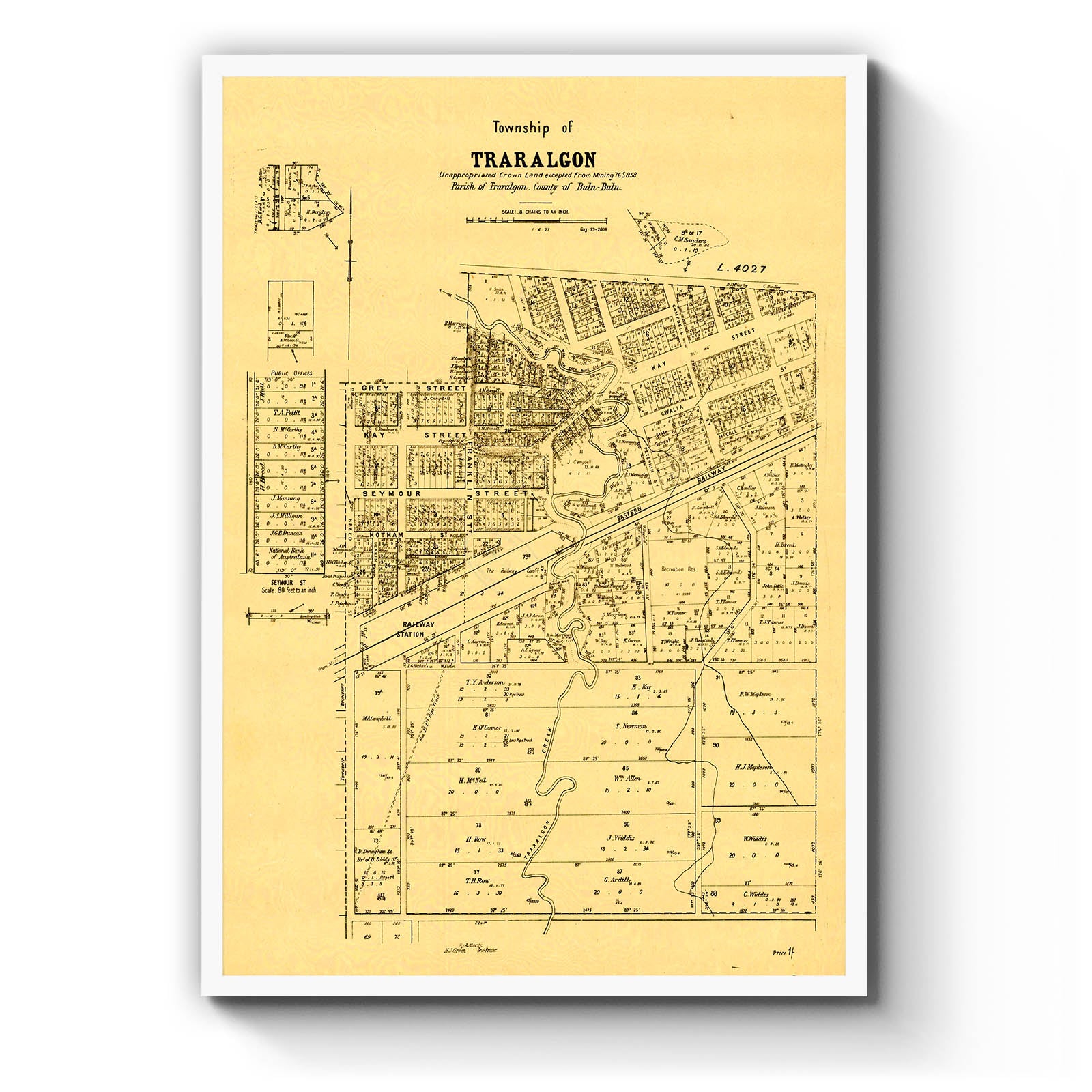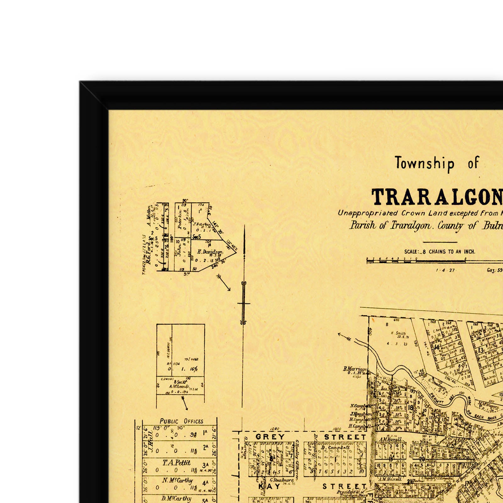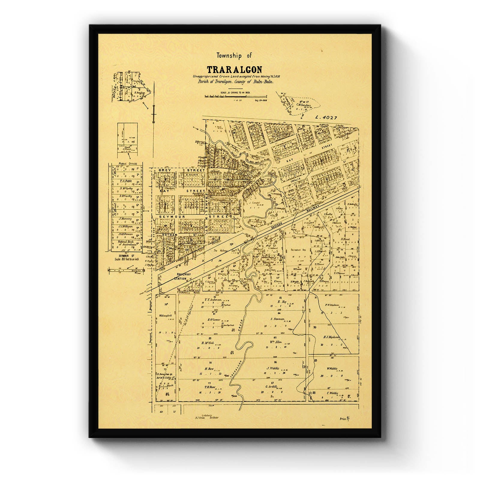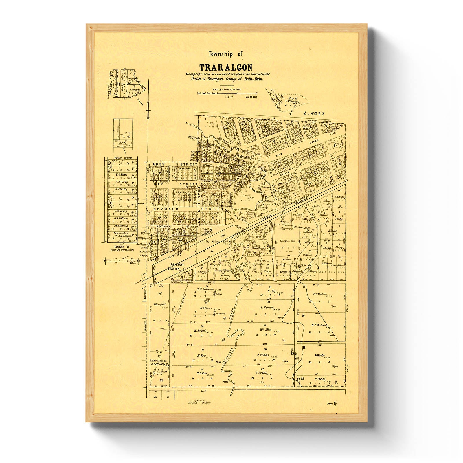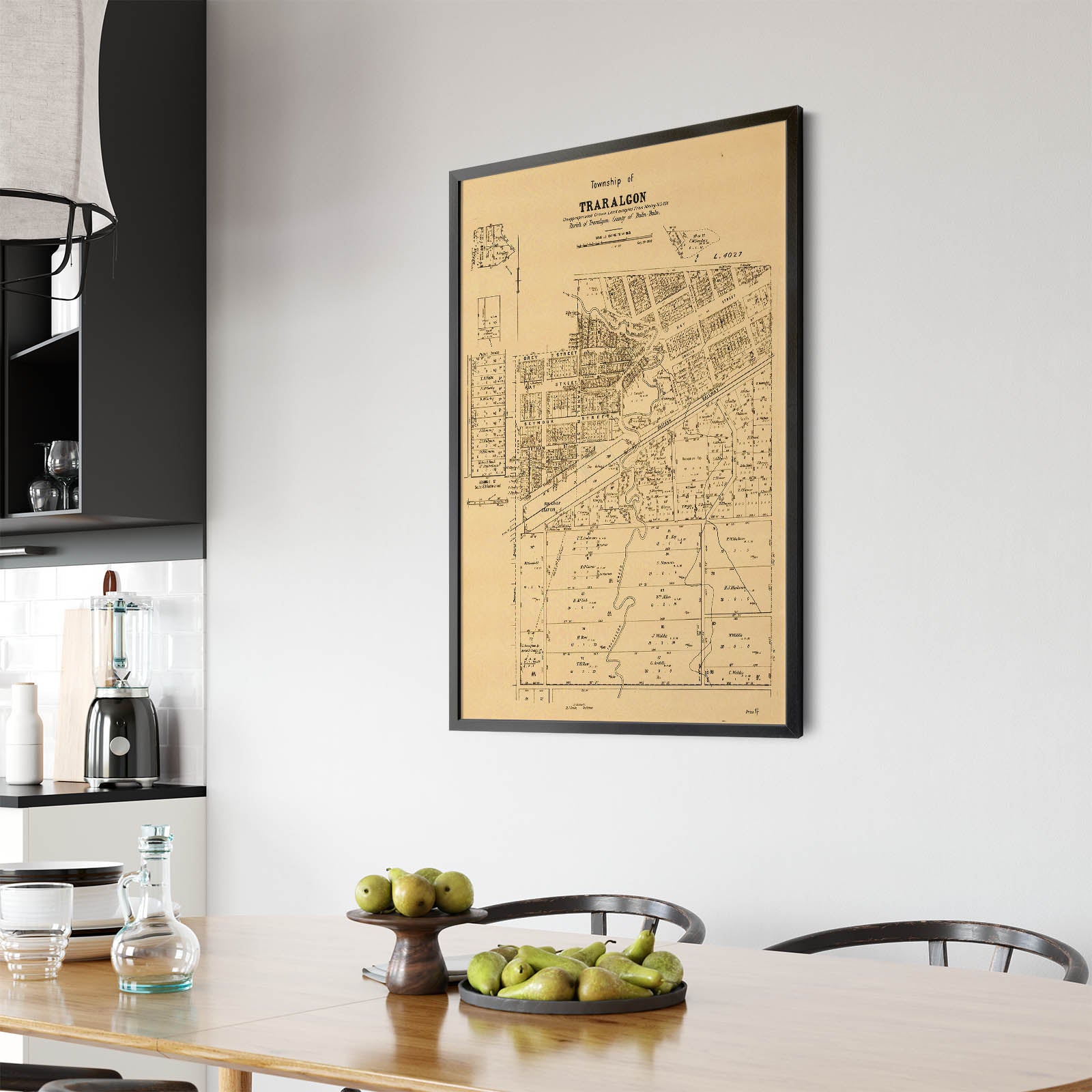 Recently moving to Harcourt and being interested in the history of the area, it seemed fitting to purchase a vintage map of the area which is displayed on our kitchen wall for us to study easily, identifying the block of land we bought. Nicely framed too.