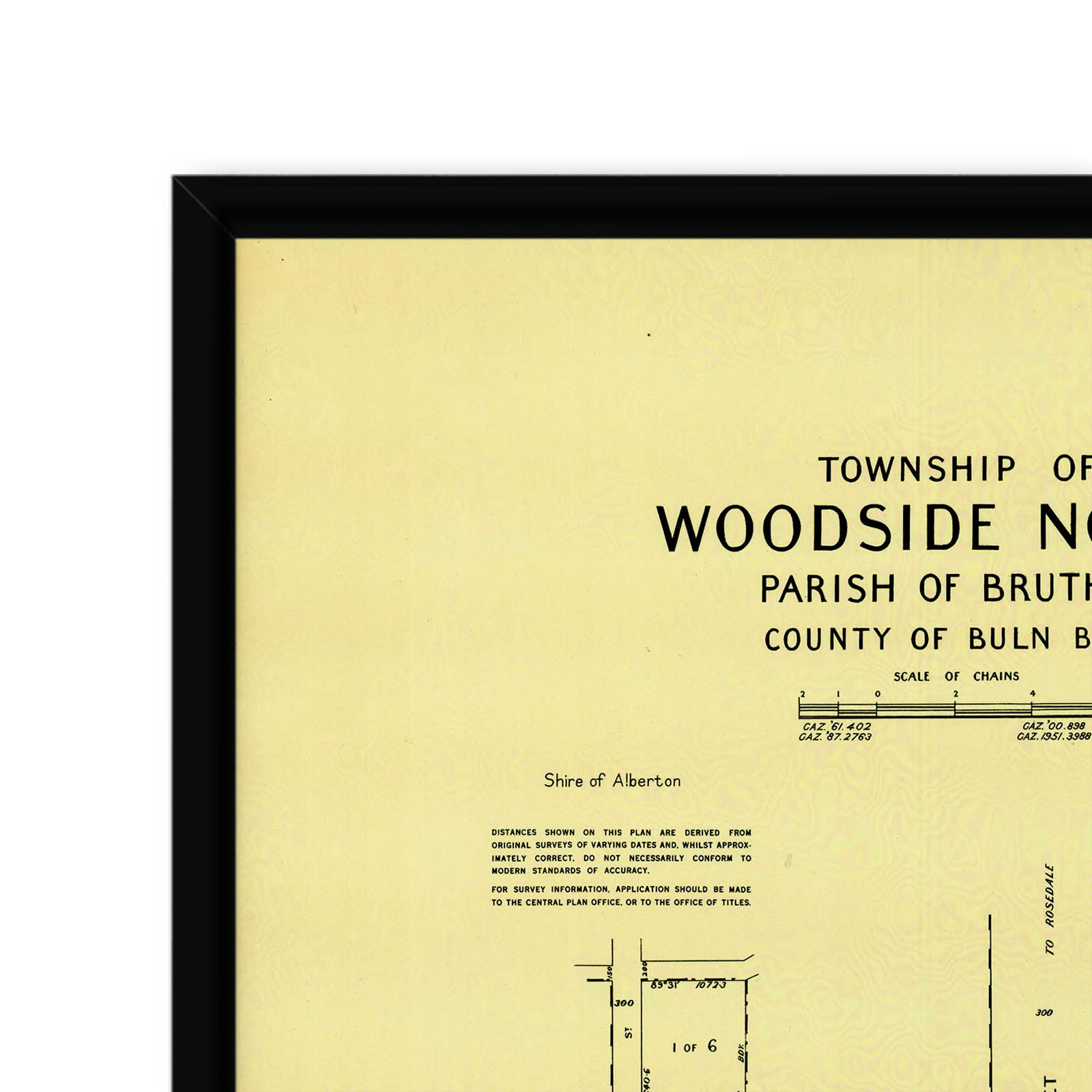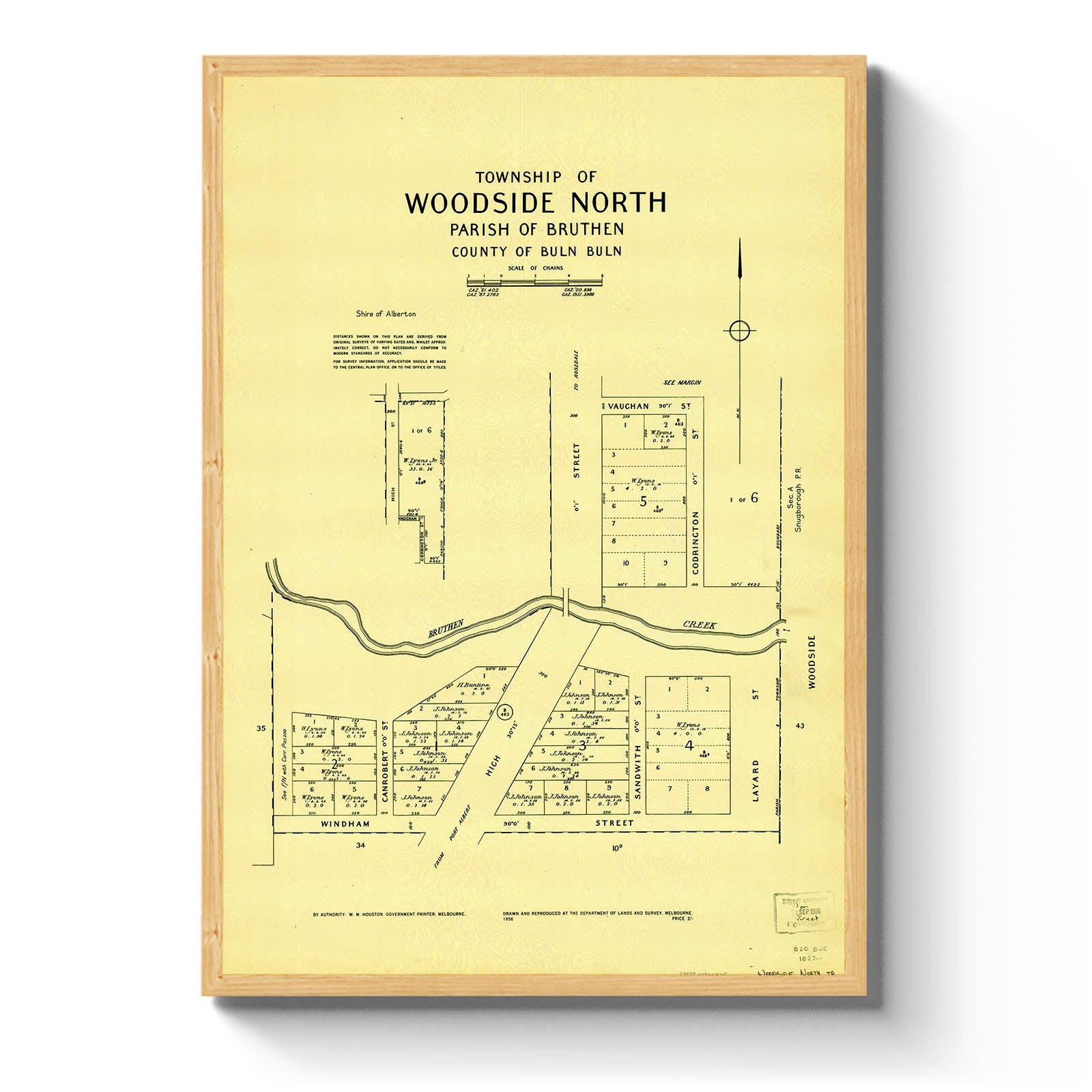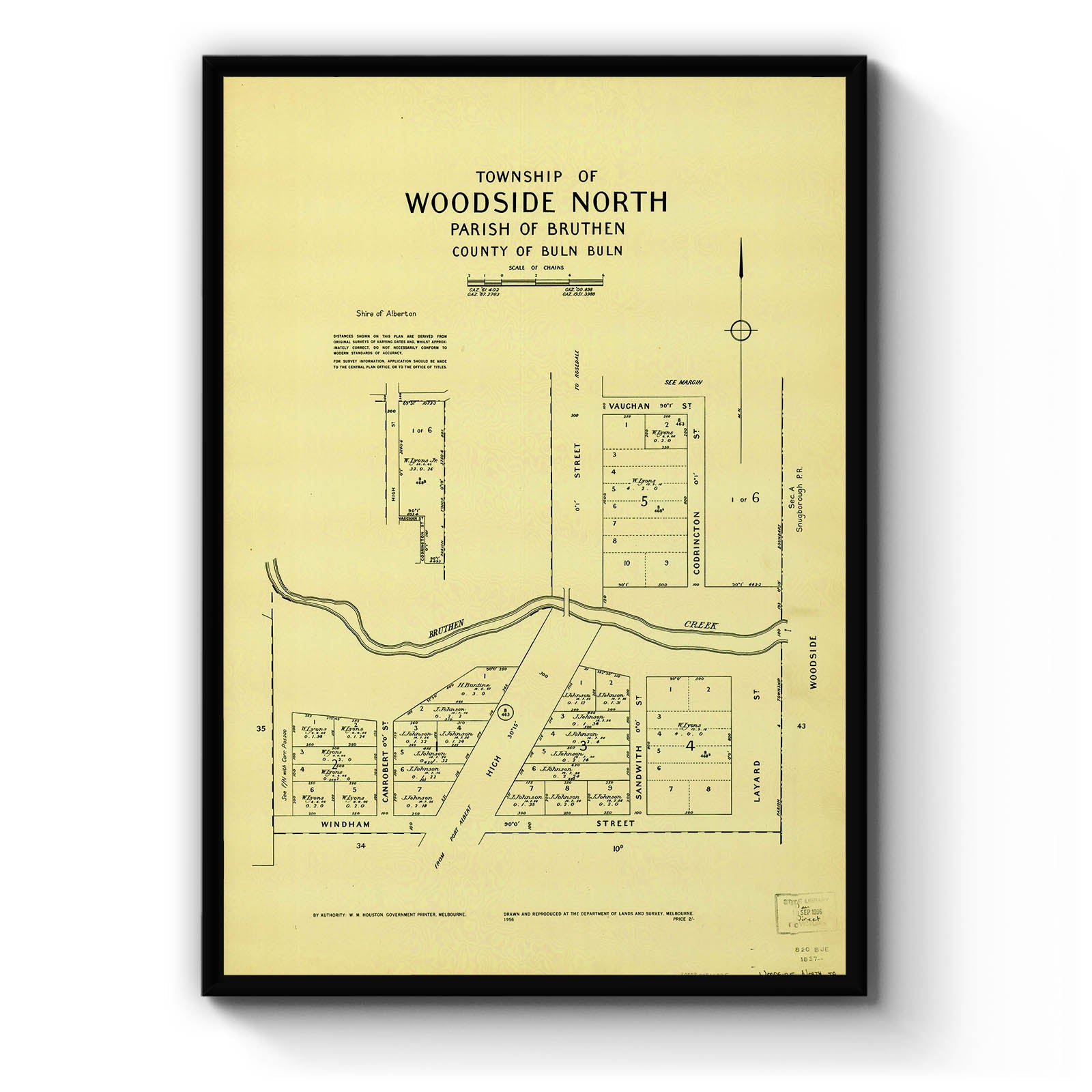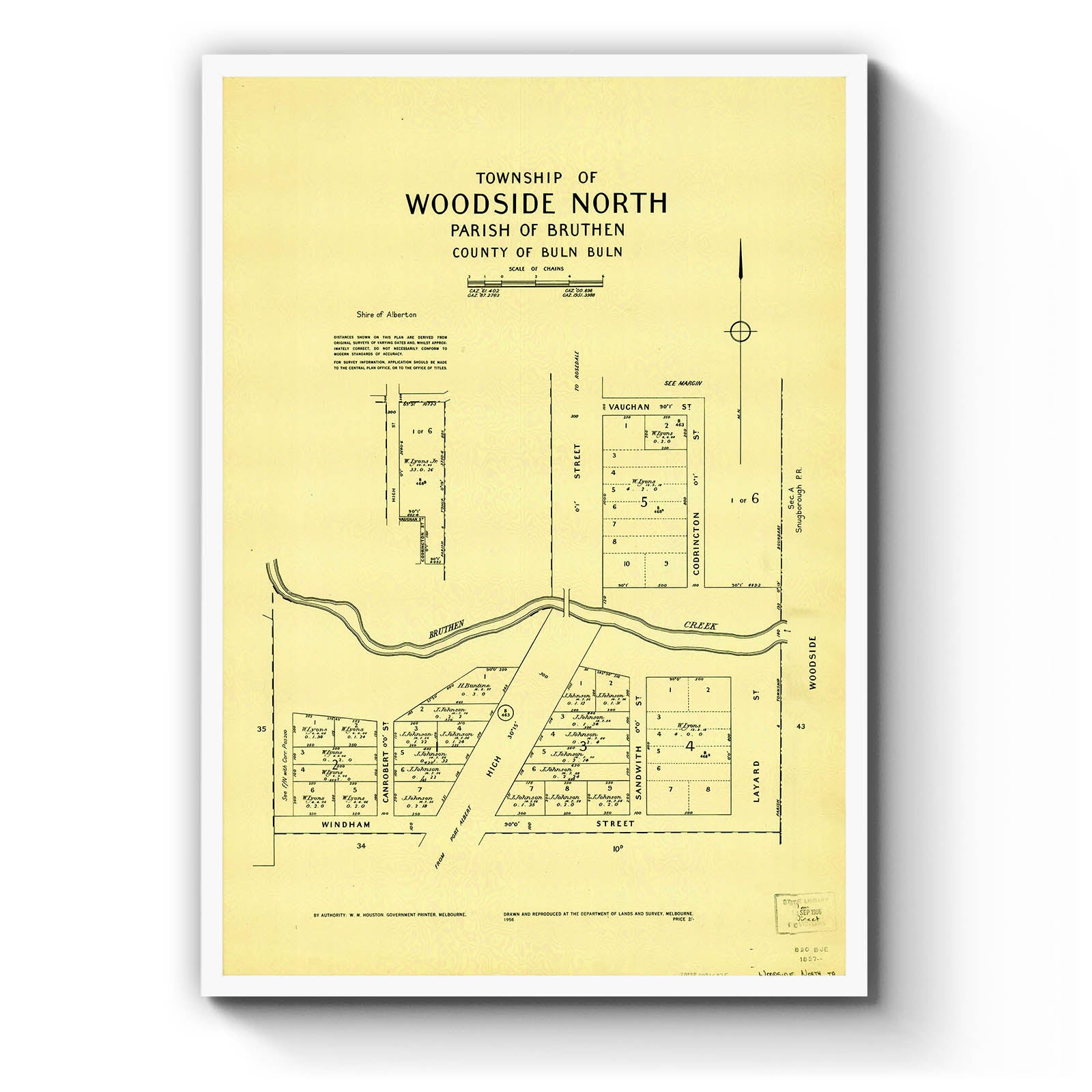 Cadastral town map of Woodside North in Victoria, showing landowners.