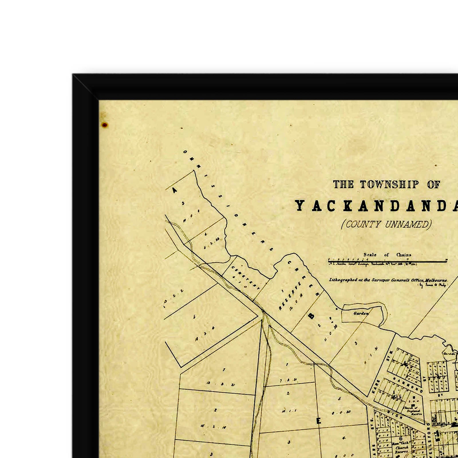Cadastral map of Yackandandah in Victoria showing land holdings.