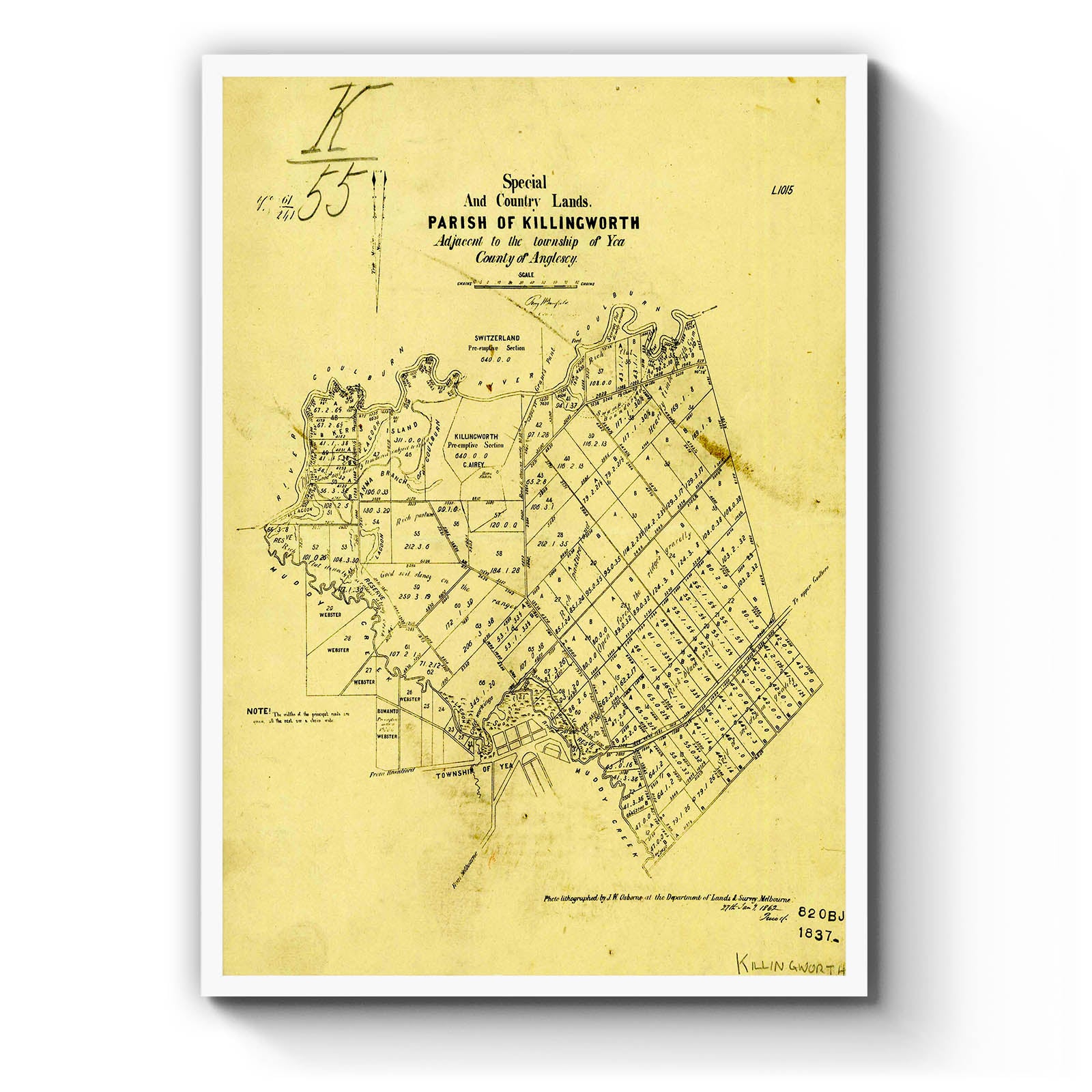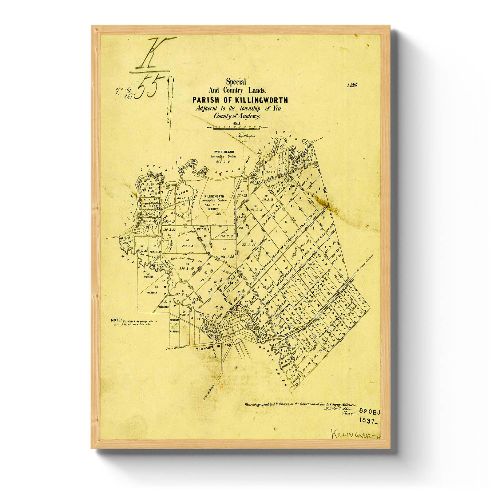 Special and country lands, Parish of Killingworth, adjacent to the Township of Yea, County of Anglesey [cartographic material] / Percy Bromfield, Contract Surveyor; photo-lithographed by J. W. Osborne at the Department of Lands & Survey, Melbourne 1862.