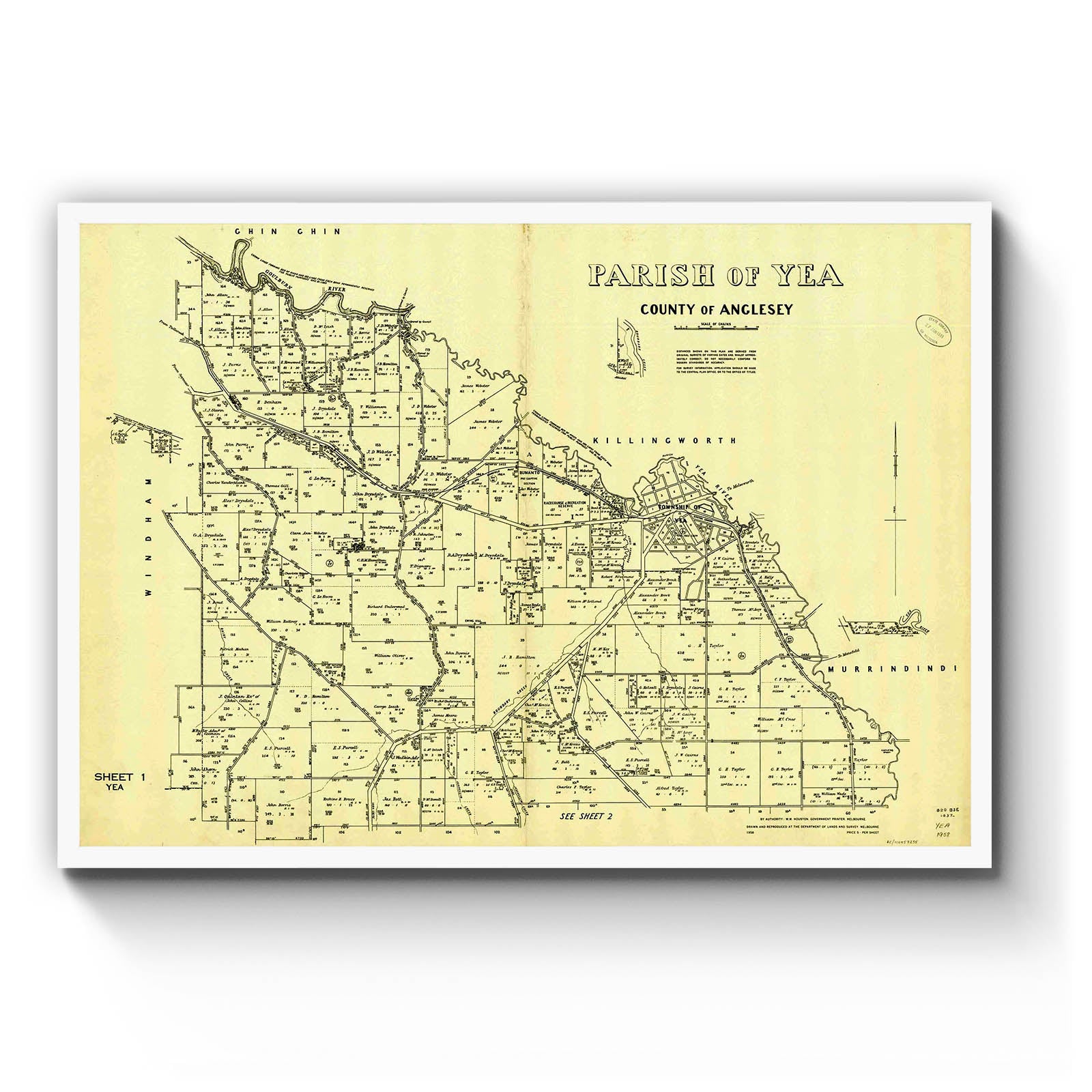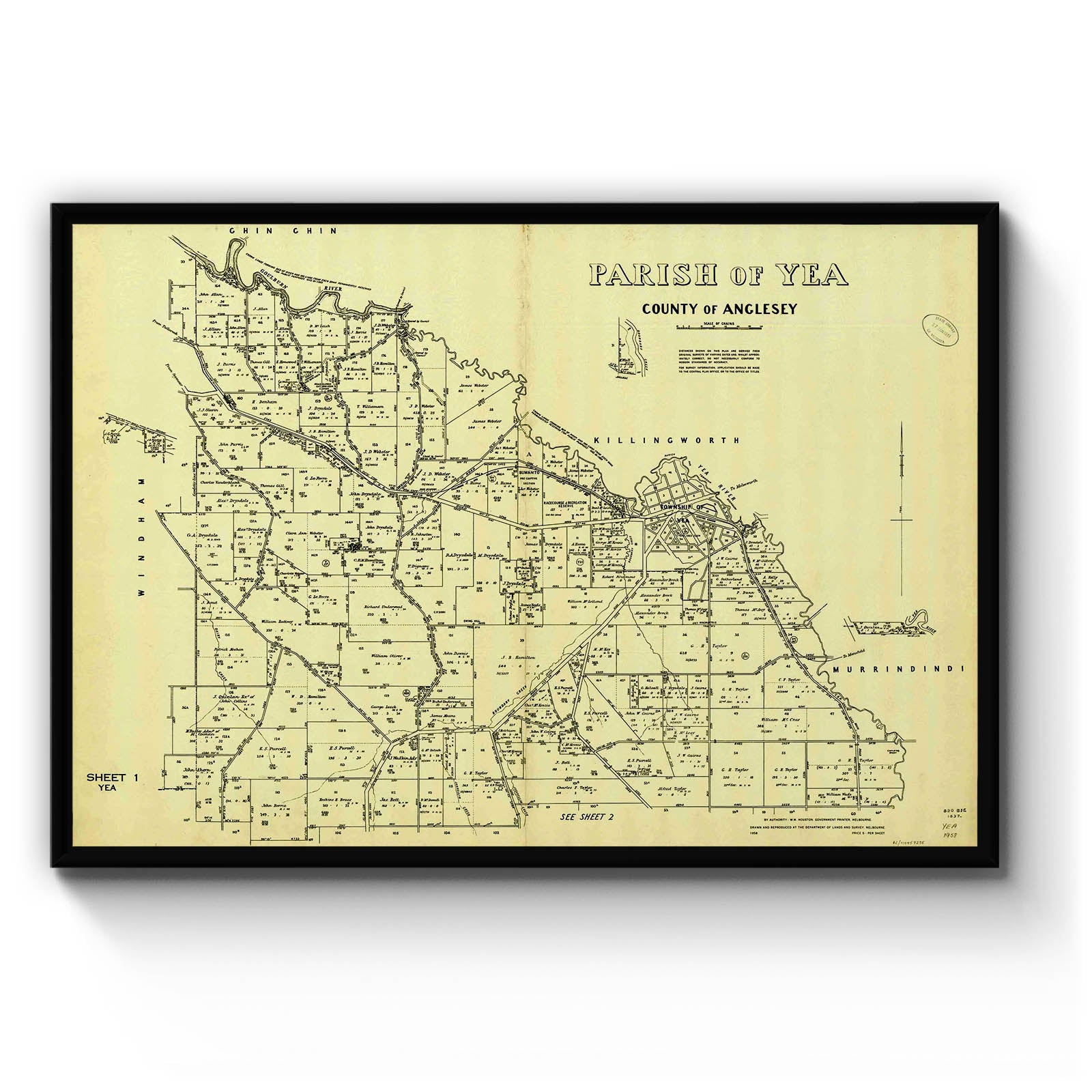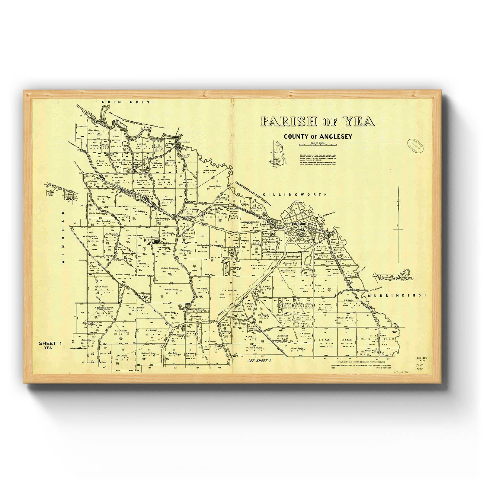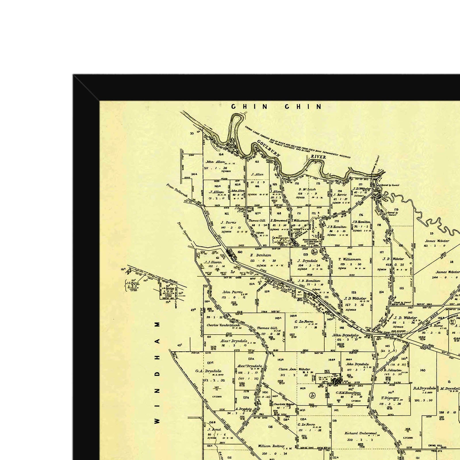Recently moving to Harcourt and being interested in the history of the area, it seemed fitting to purchase a vintage map of the area which is displayed on our kitchen wall for us to study easily, identifying the block of land we bought. Nicely framed too.